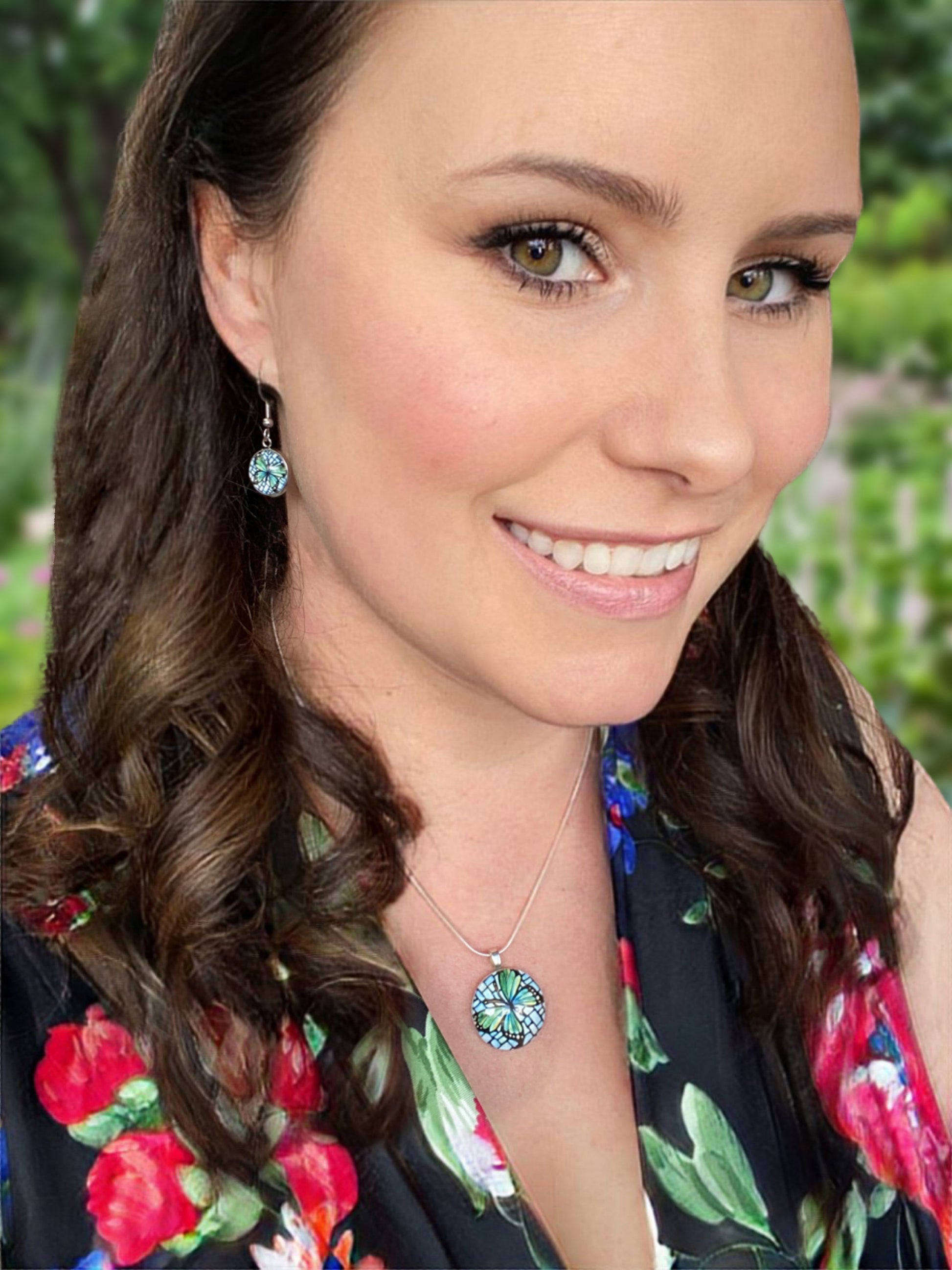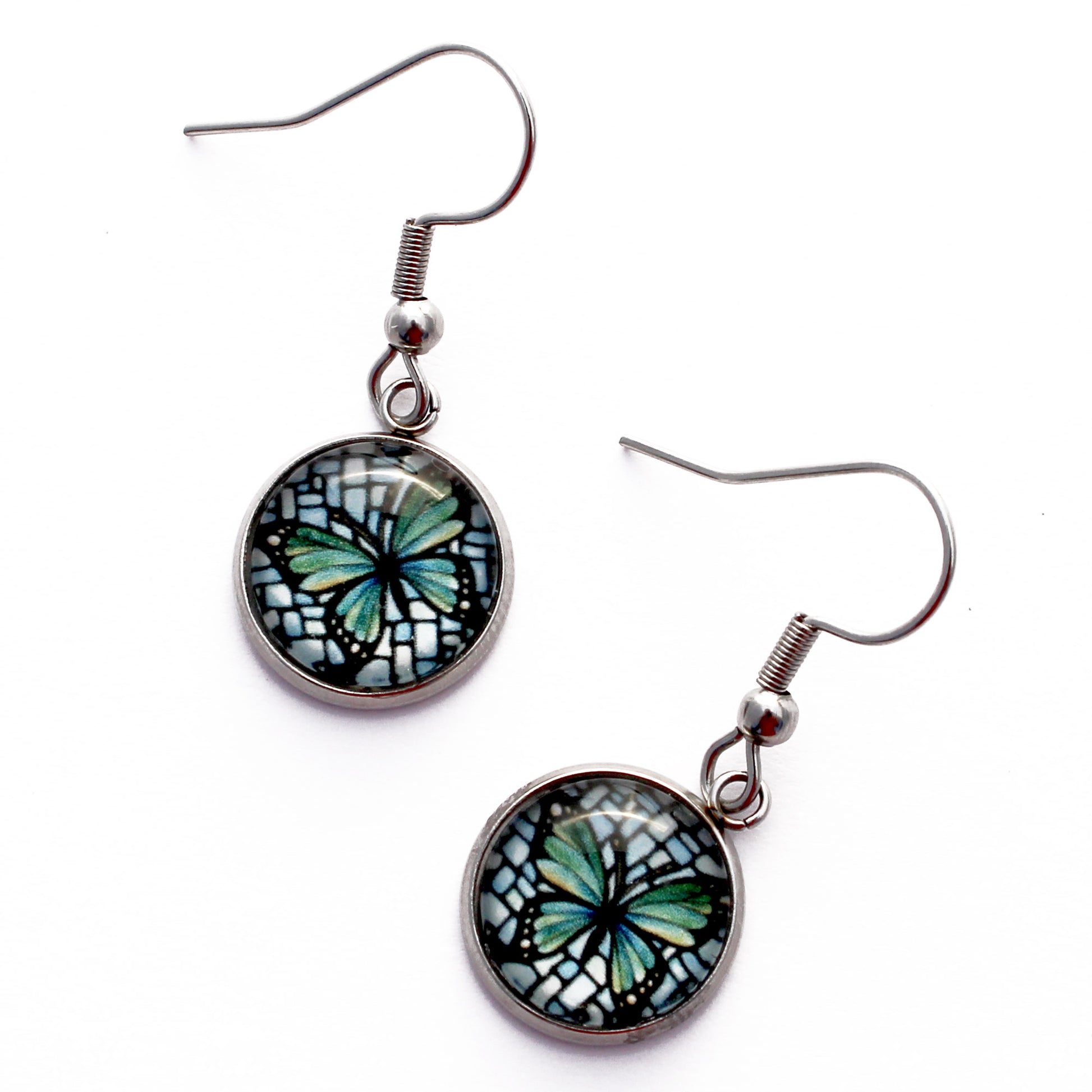 These delicate circle earrings feature a teal butterfly on a light blue background, using imagery from my original acrylic painting. Graceful and uplifting, they capture the quiet magic of transformation in a soft, nature-inspired palette. Lightweight and easy to wear, they make a lovely gift or a peaceful addition to your everyday style.