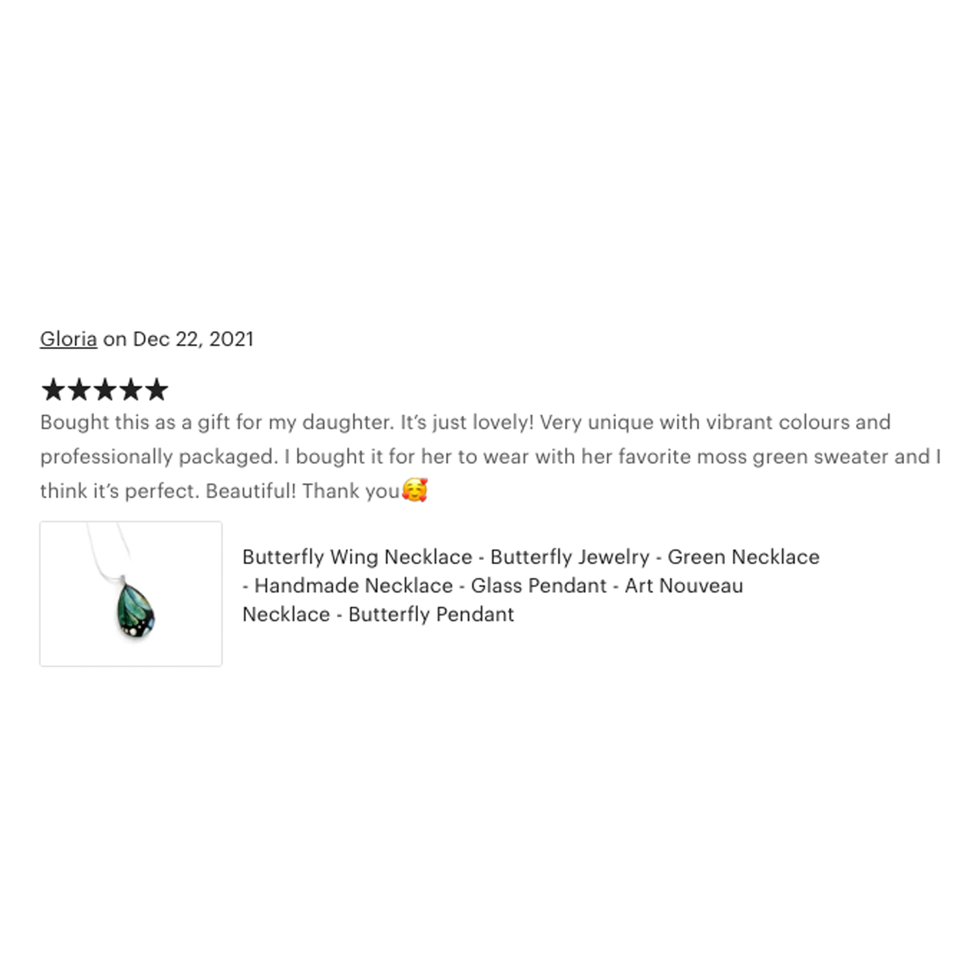 Handmade green and teal butterfly wing teardrop glass necklace featuring artwork from my original acrylic painting.
