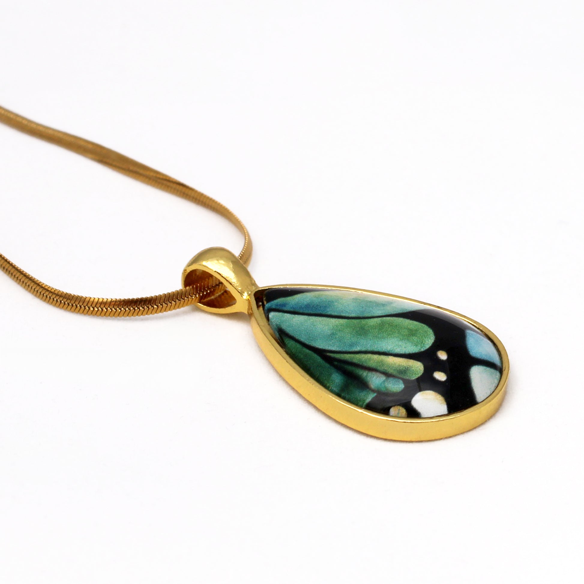 Handmade green and teal butterfly wing teardrop glass necklace featuring artwork from my original acrylic painting.