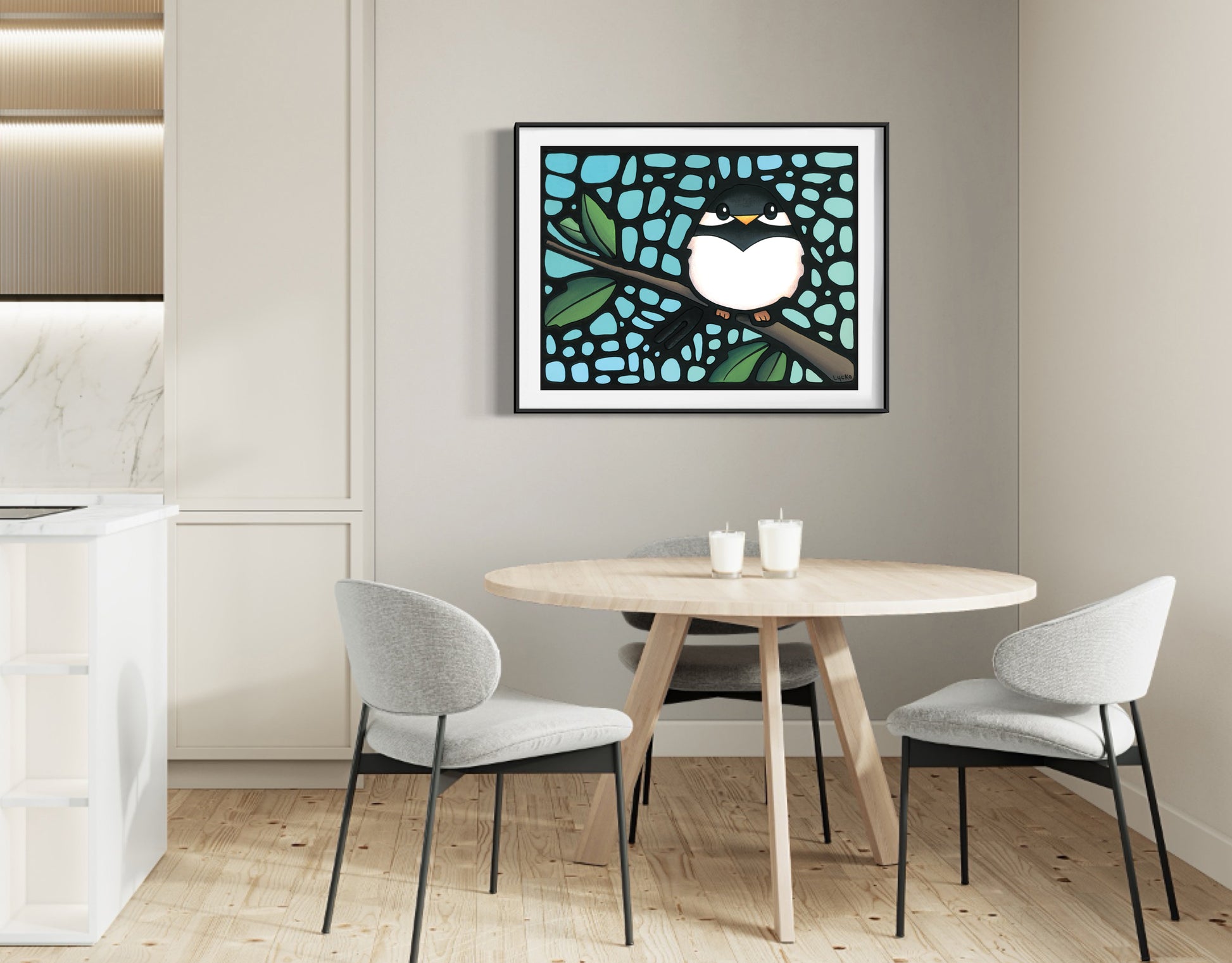 Start your day with the gentle spirit of 'Friendly Morning', my original acrylic painting turned fine art print. This cheerful little bird perches on a branch against a stained-glass inspired sky, radiating warmth and quiet joy.