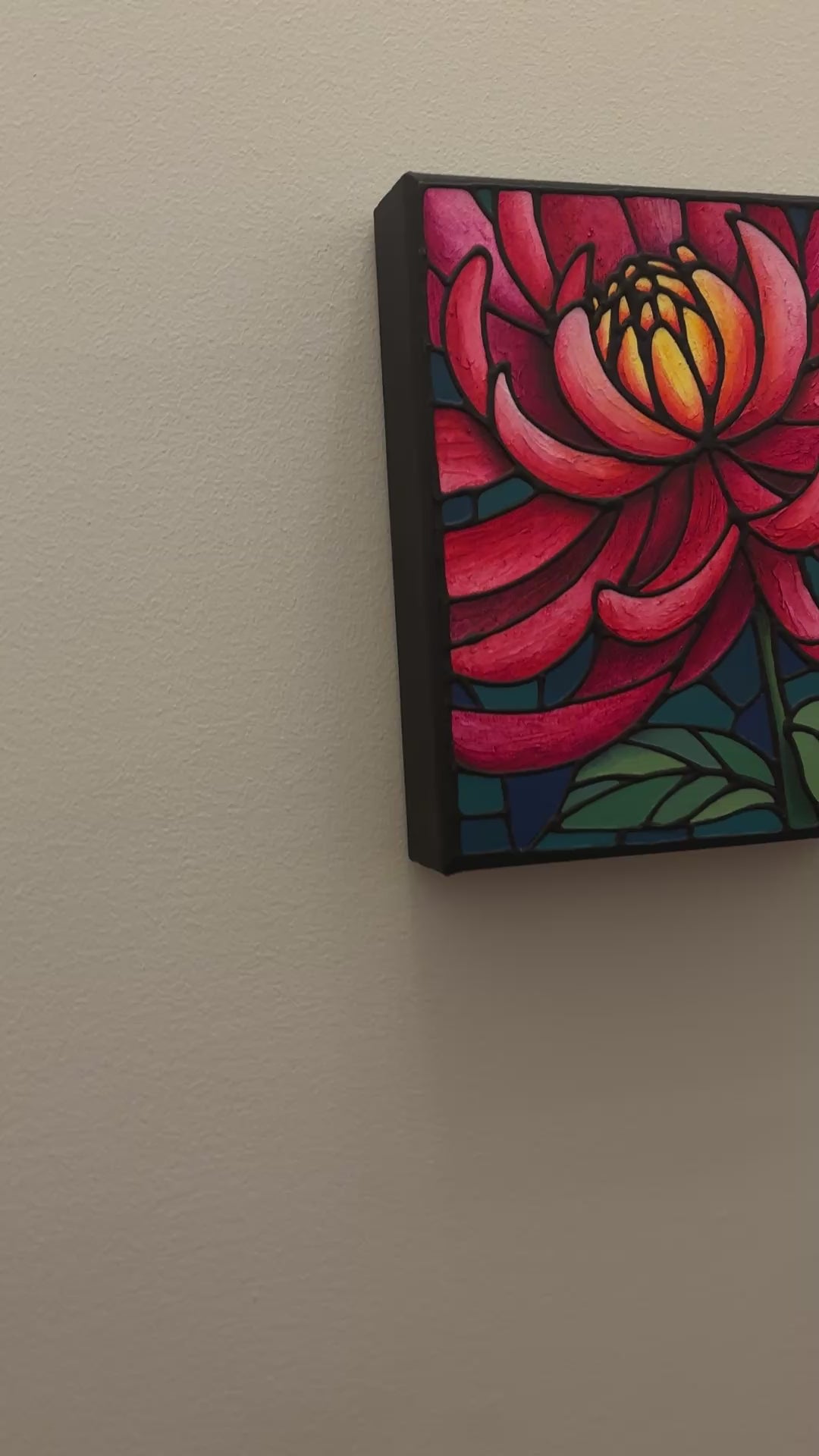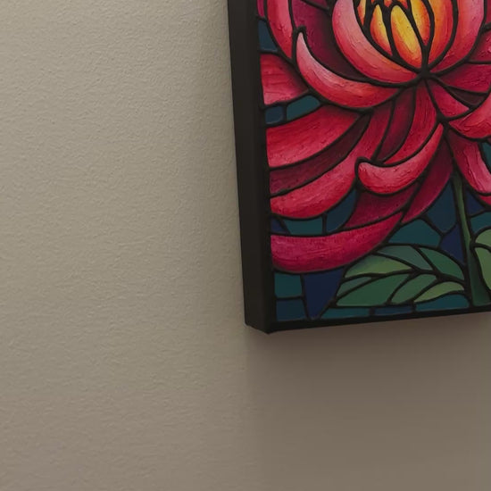 A chrysanthemum in full bloom, painted like a pane of stained glass catching morning light. Layers of curved petals spiral outward in rich pinks and corals, each one outlined in bold black like lead lines in a cathedral window. At the centre, a glowing golden heart radiates warmth, pulling the eye inward before letting it drift back across the petals.