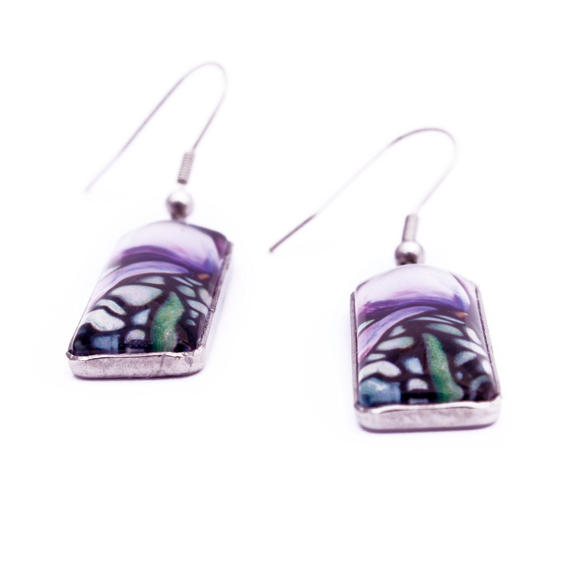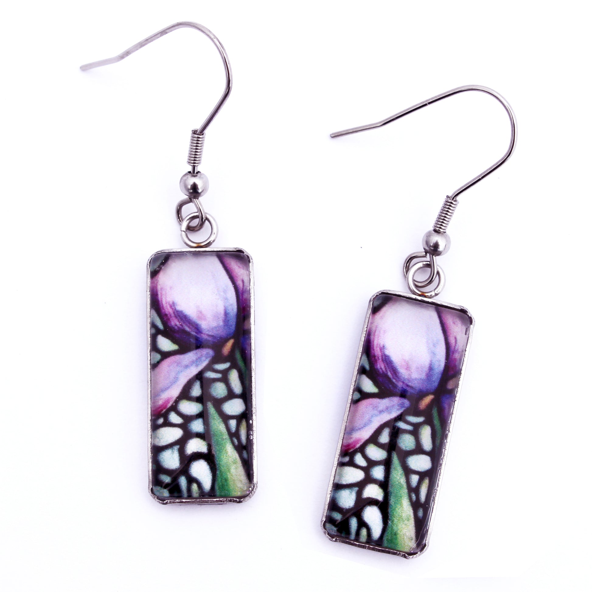 These elegant rectangle earrings feature a striking purple iris, using imagery from my original acrylic painting. The clean shape and rich floral detail make them a beautiful balance of modern design and natural beauty. Lightweight and unique, they’re perfect for anyone who loves art, flowers, and bold accessories.