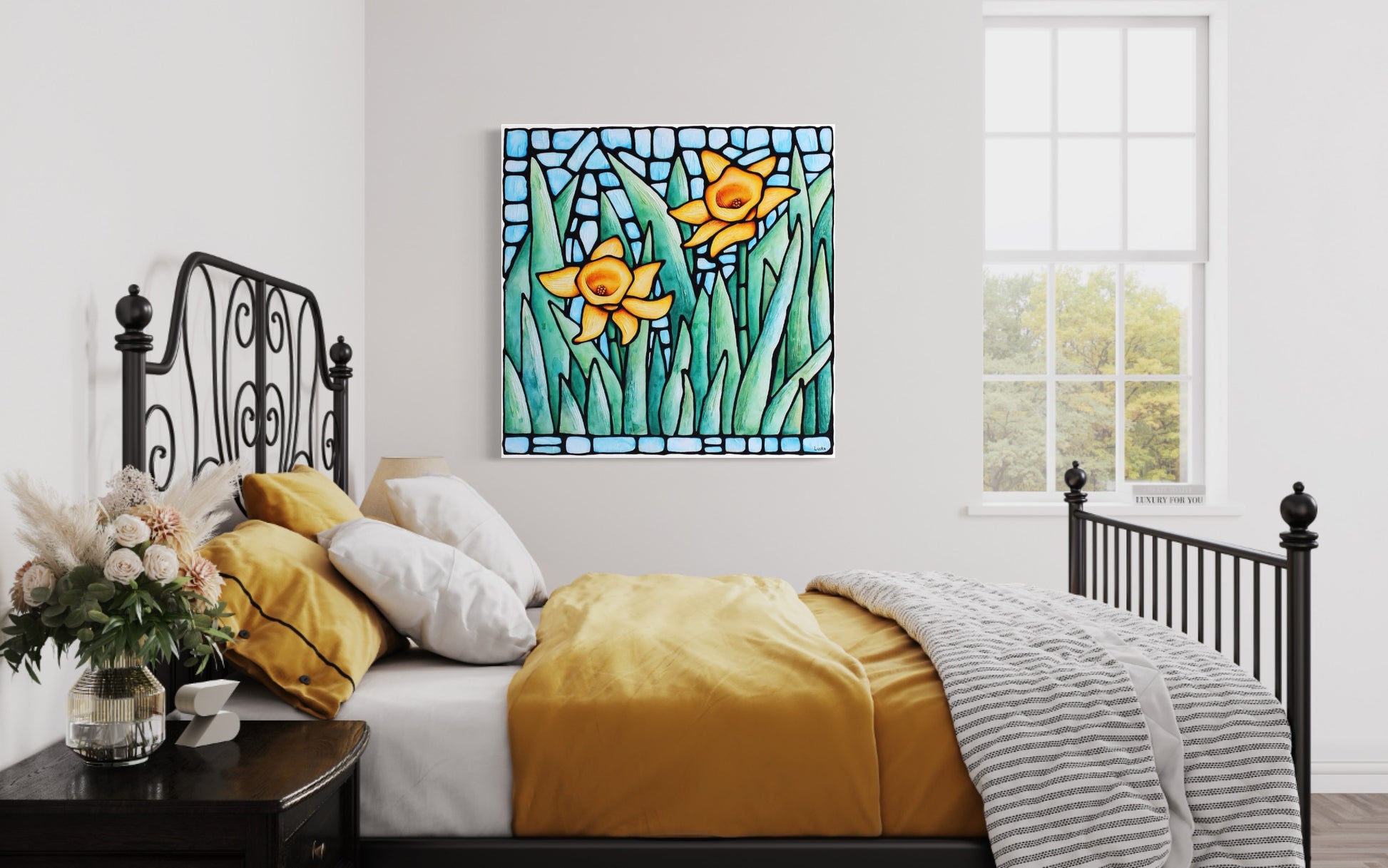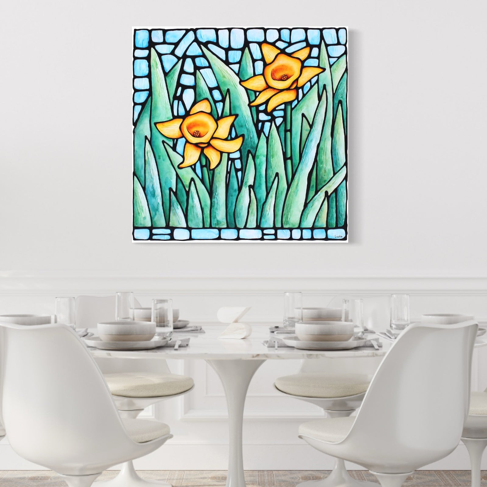 2 beautiful yellow daffodils on a green garden background, original acrylic painting.