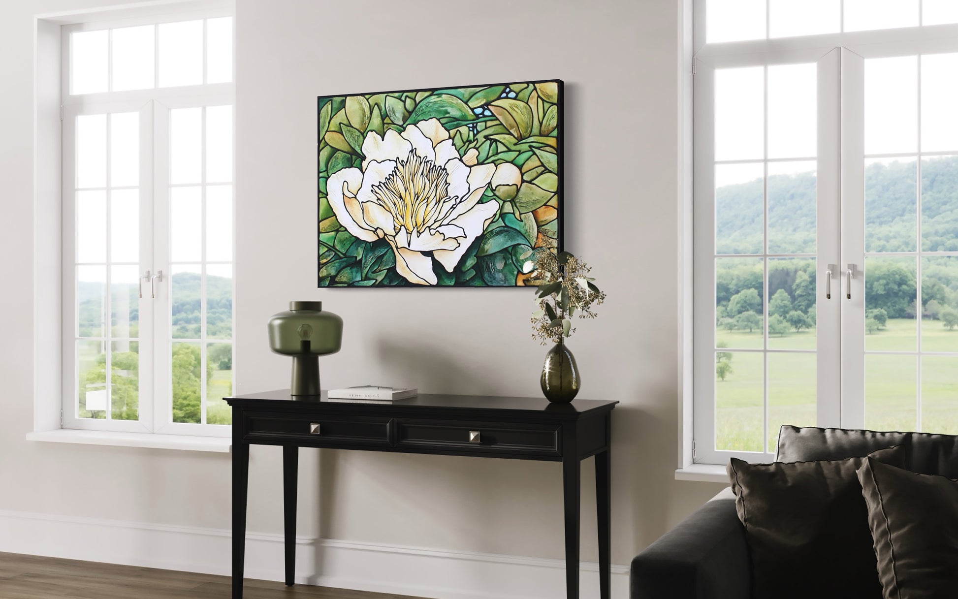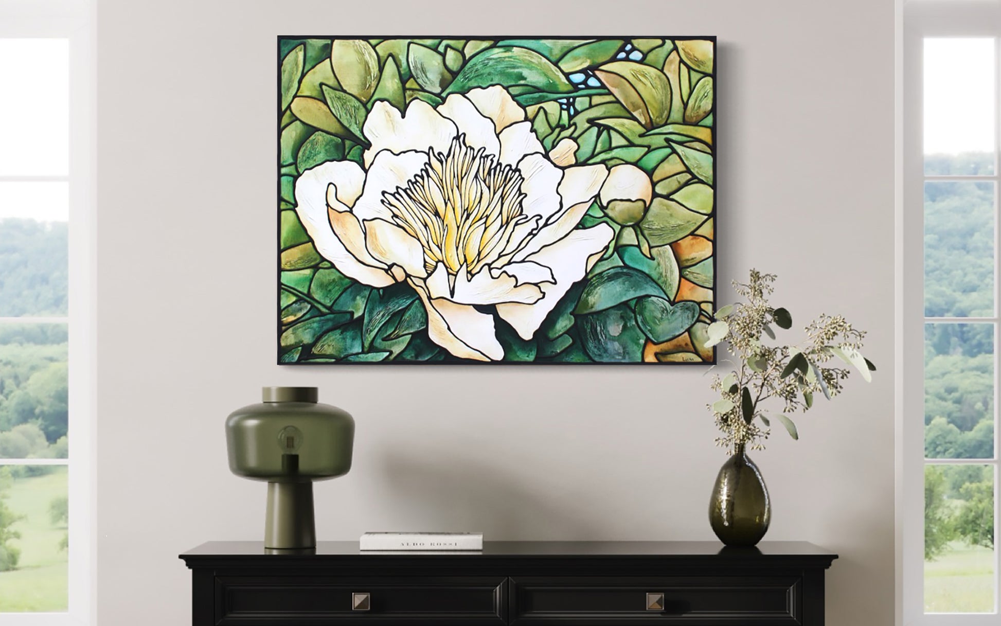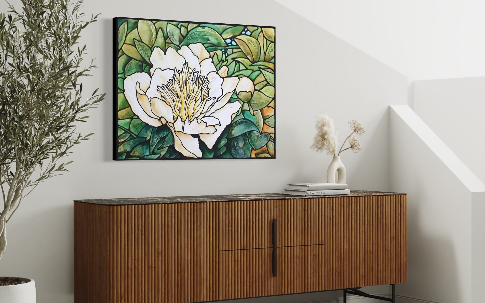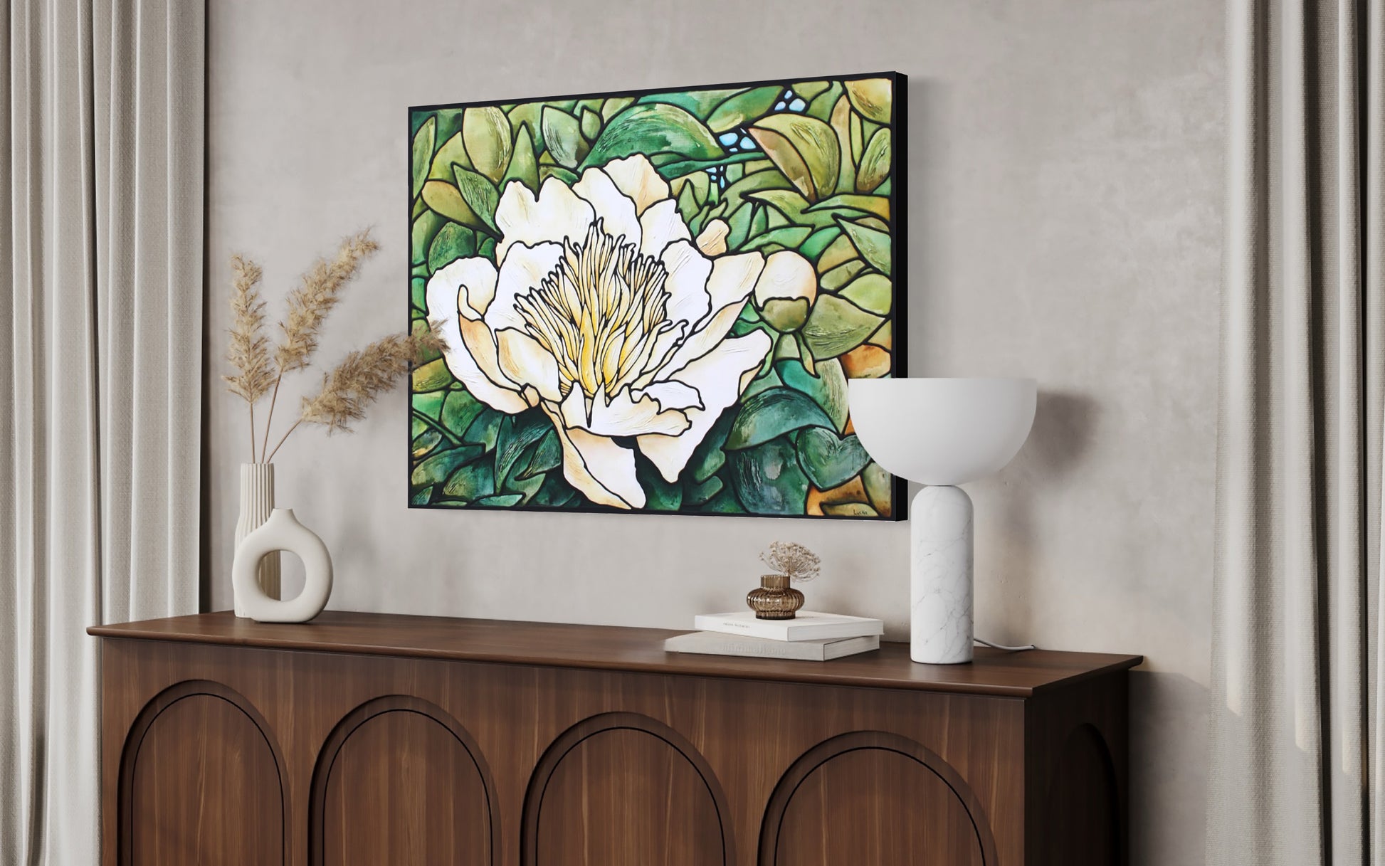 The stained-glass style gives each leaf and petal a sense of structure and clarity. They hold the chaos at bay while allowing beauty to unfold freely within. In the centre, golden strands radiate warmth, hinting at something timeless: renewal, peace, the quiet allure of spring's arrival.