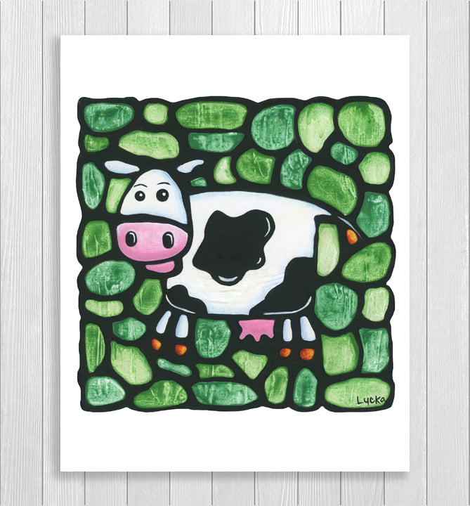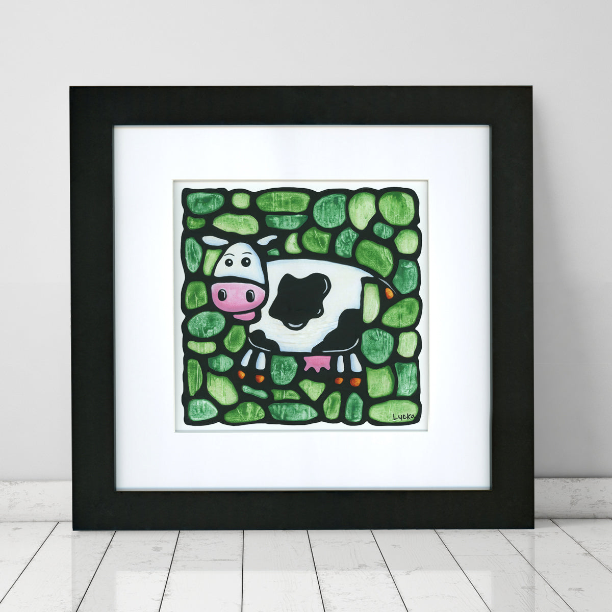 Cow wall art print featuring my original acrylic painting. A playful and heartwarming piece that brings charm to any space. Perfect for animal lovers and collectors alike.