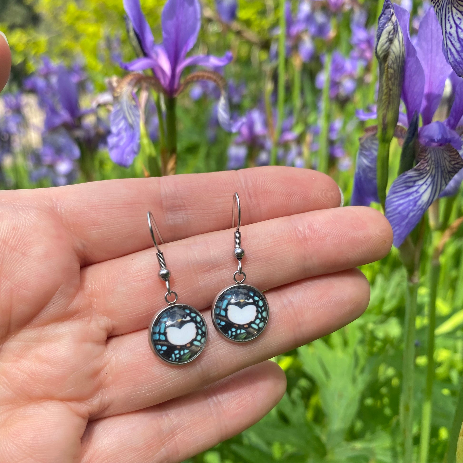 These charming circle earrings feature a sweet chickadee bird on a turquoise background, using imagery from my original acrylic painting. Light, playful, and full of personality, they bring a little woodland wonder to your everyday style. Perfect for bird lovers and anyone who enjoys nature-inspired art you can wear.