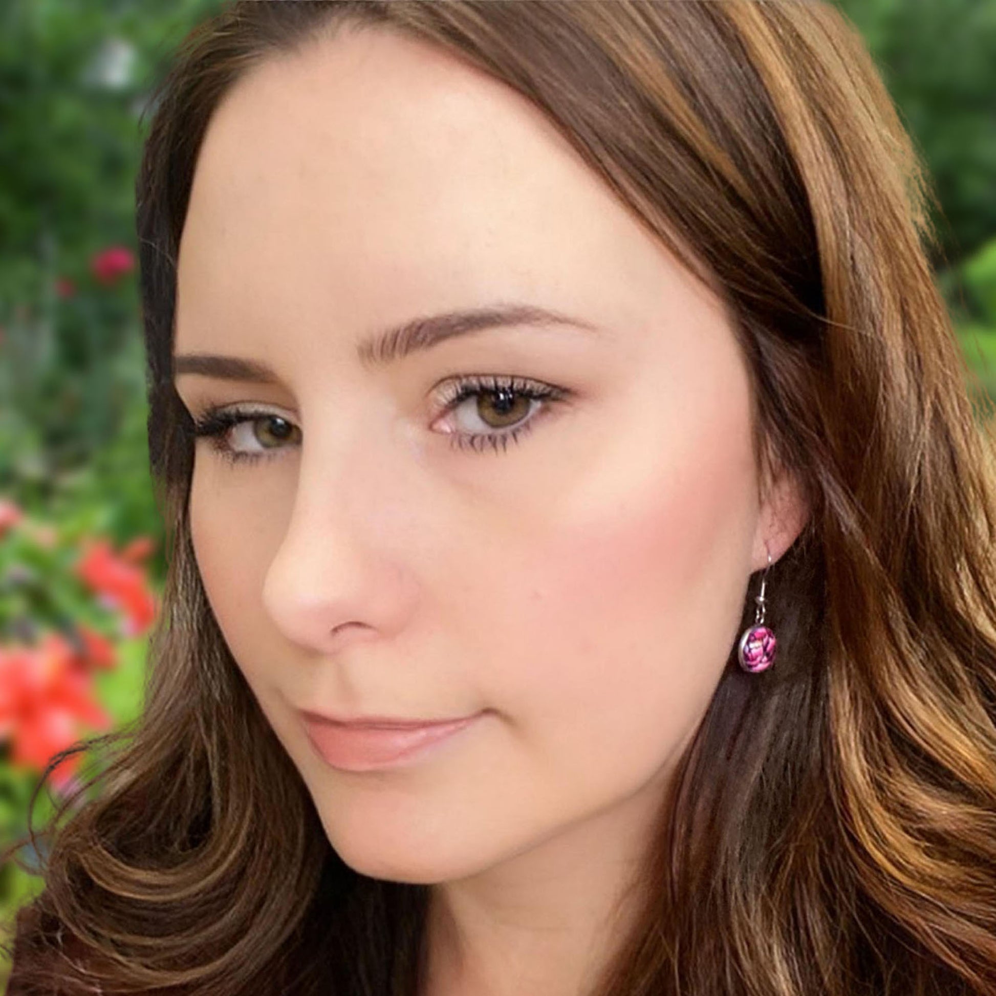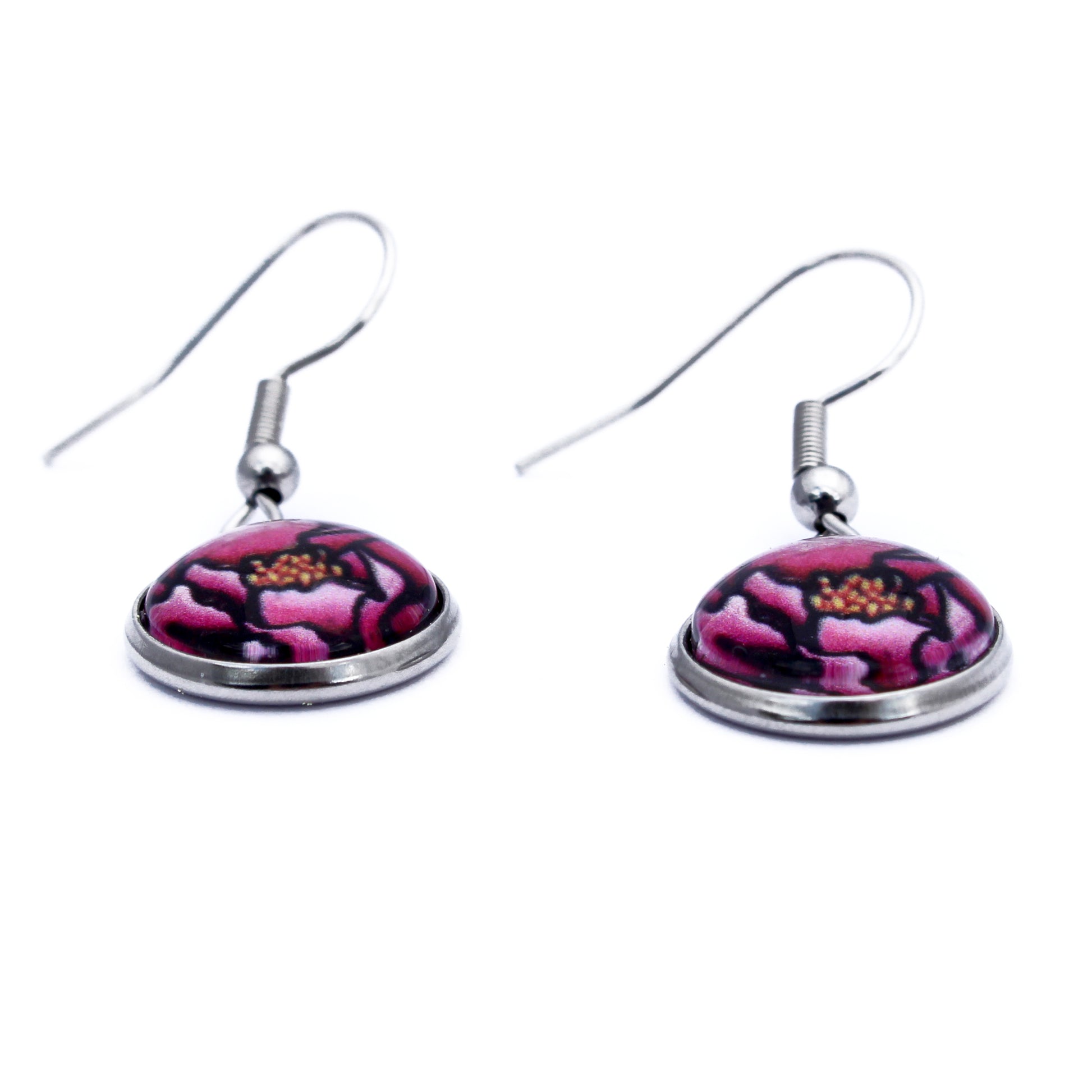 These circle dangle earrings feature a deep pink peony in full bloom, using imagery from my original acrylic painting. Soft, romantic, and full of delicate detail, they bring the elegance of a garden classic to your everyday look. Lightweight and feminine, they’re a lovely choice for flower lovers and art enthusiasts alike.