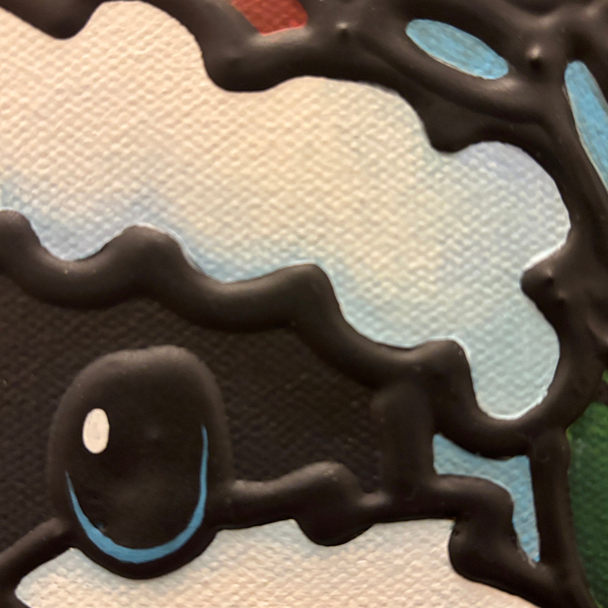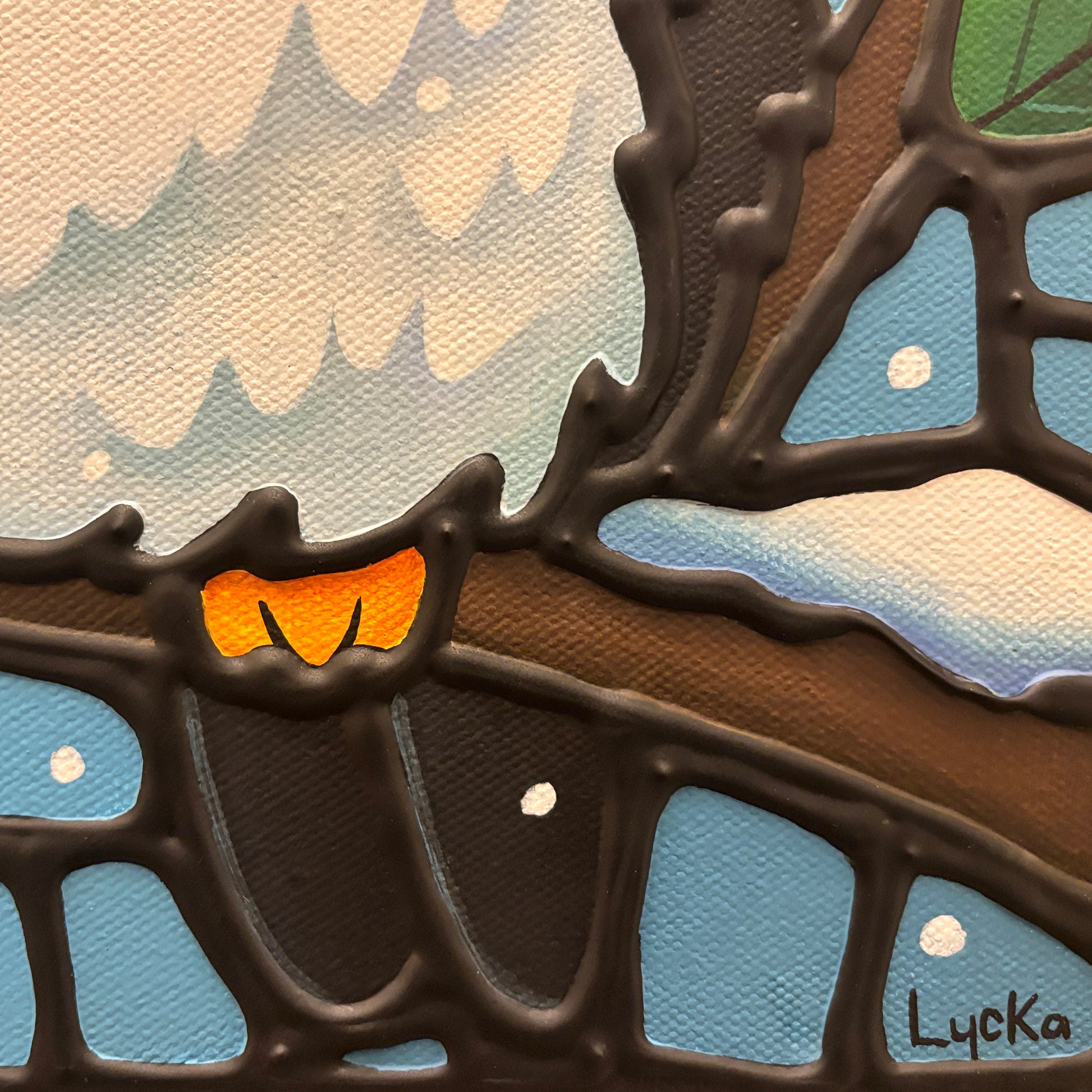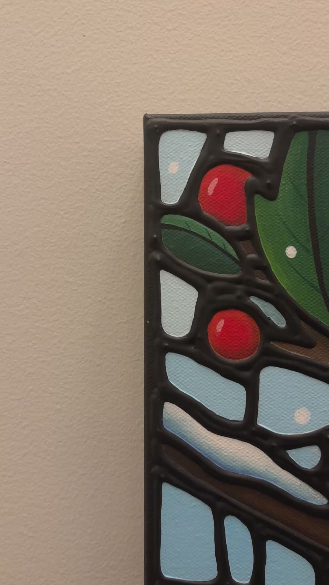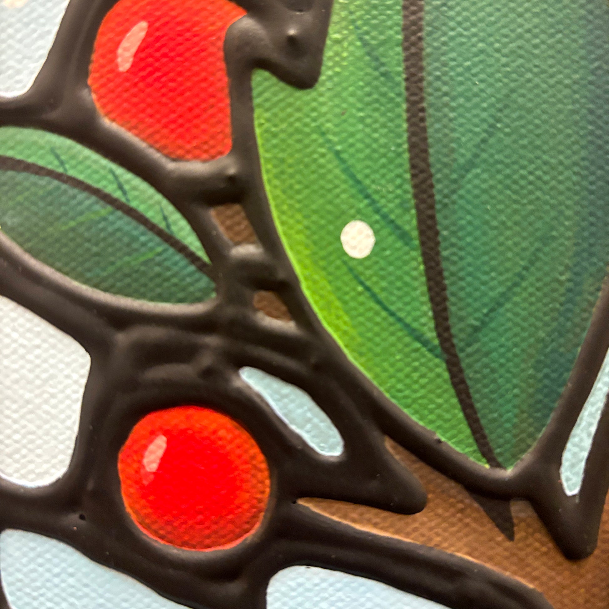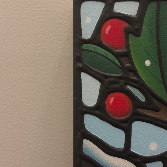 This cute chickadee sits on a snowy branch wearing a bright red Santa hat. The painting has bold outlines and soft colours that make it look like stained glass. Red berries, green leaves, and a fluffy winter sky bring the whole scene to life. It is a sweet and cheerful piece that is perfect for anyone who loves birds or holiday art.