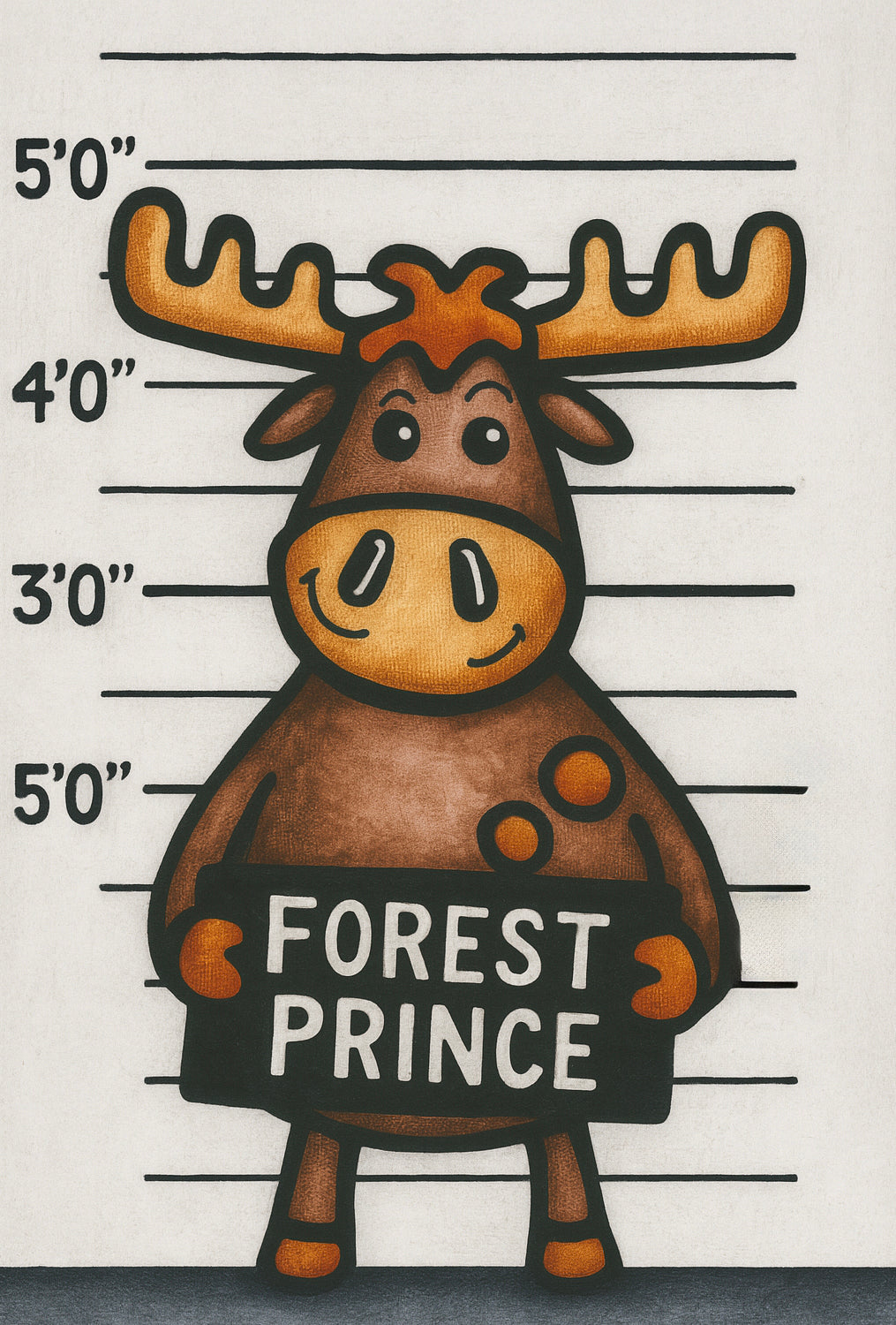 Don’t be fooled by the fuzzy face. I thought this little moose was all charm and cuddles, but he’s been leading a double life. One crime spree later and he’s locked up with a growing list of woodland misdemeanours.