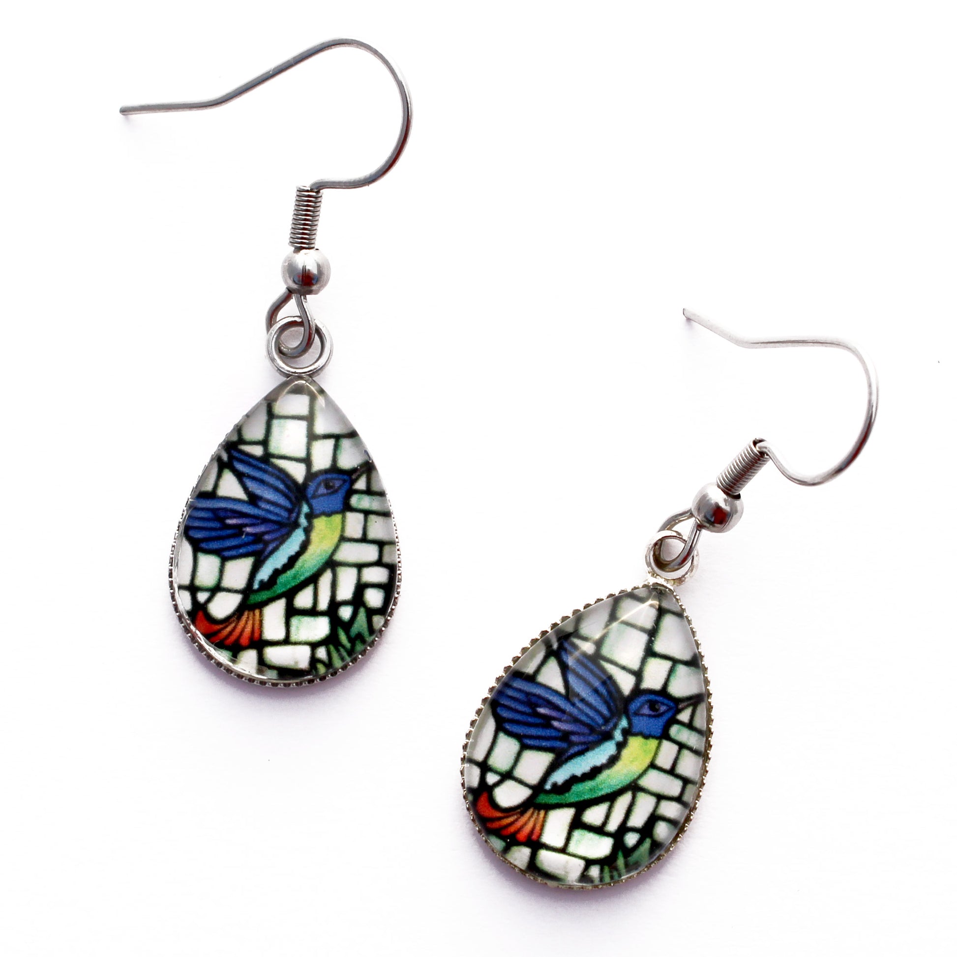 These vibrant teardrop earrings feature a lively hummingbird in shades of purple, green, and orange, using imagery from my original acrylic painting. Lightweight and full of movement, they capture the spirit of this tiny bird in flight. A joyful accessory for nature lovers and anyone who enjoys wearable art.