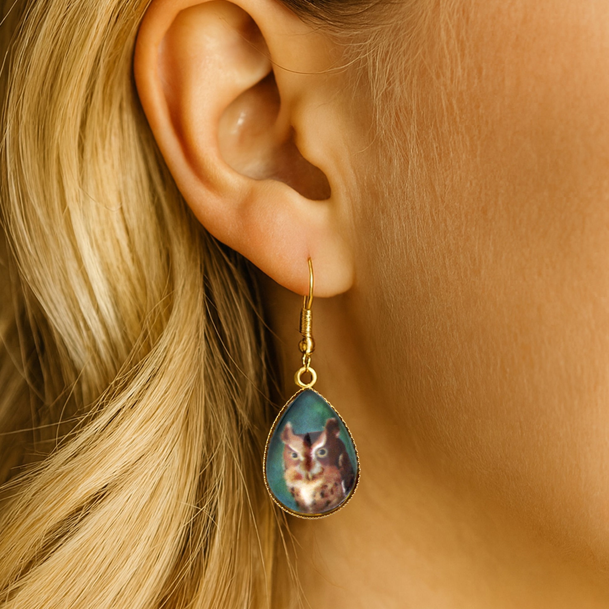 These vibrant teardrop earrings feature a lively hummingbird in shades of purple, green, and orange, using imagery from my original acrylic painting. Lightweight and full of movement, they capture the spirit of this tiny bird in flight. A joyful accessory for nature lovers and anyone who enjoys wearable art.