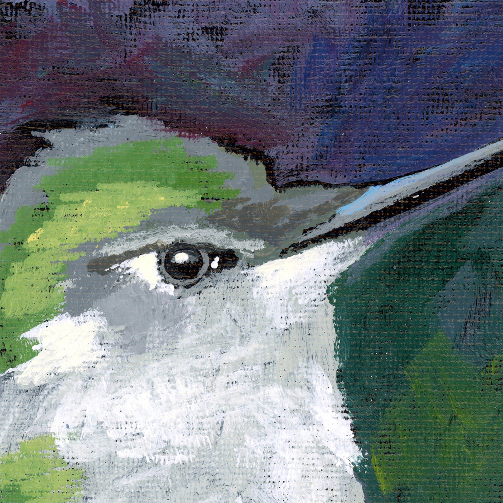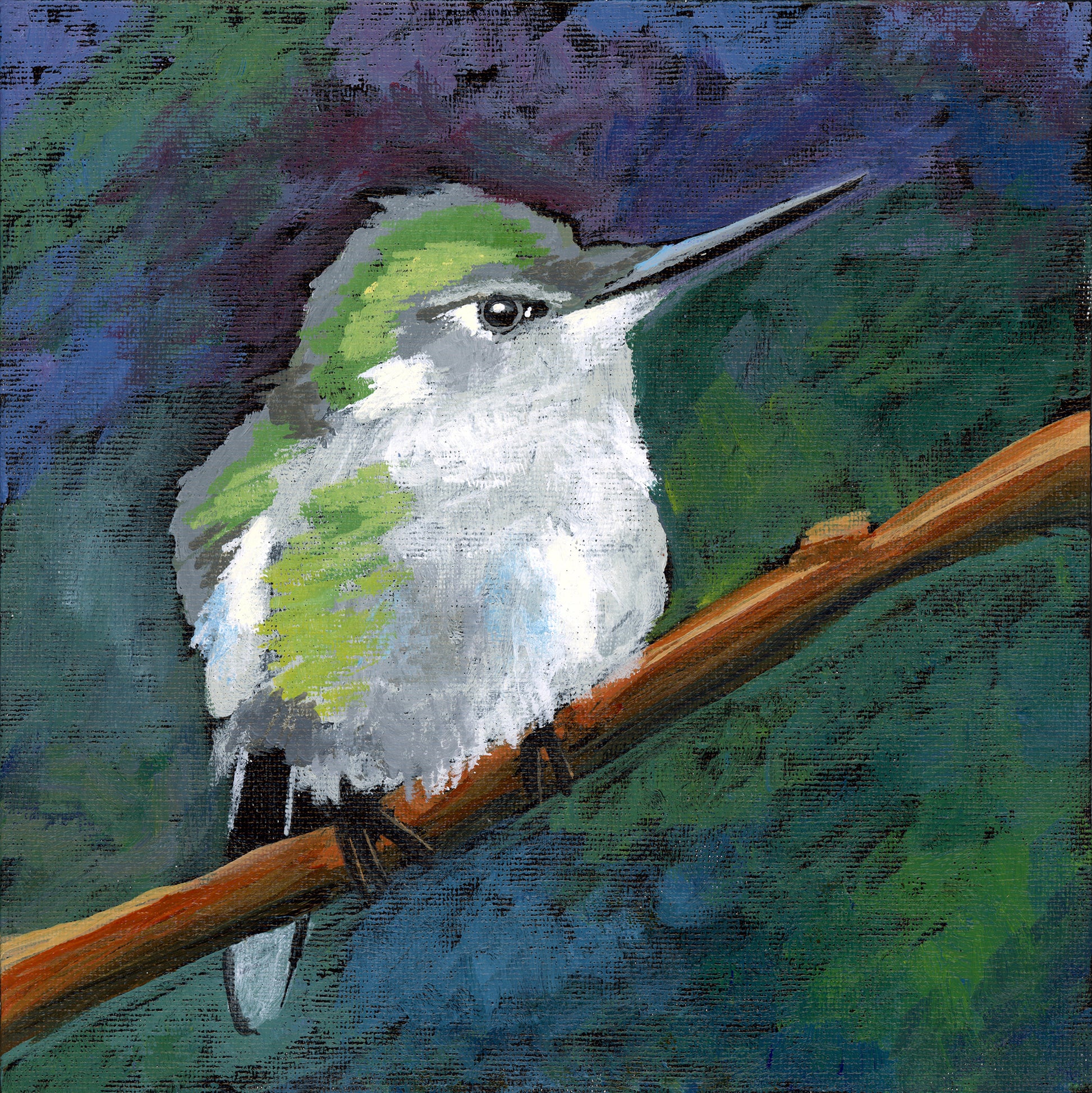 Adorable hummingbird original acrylic painting on canvas board. Display as is on a little easel or frame anyway you like.