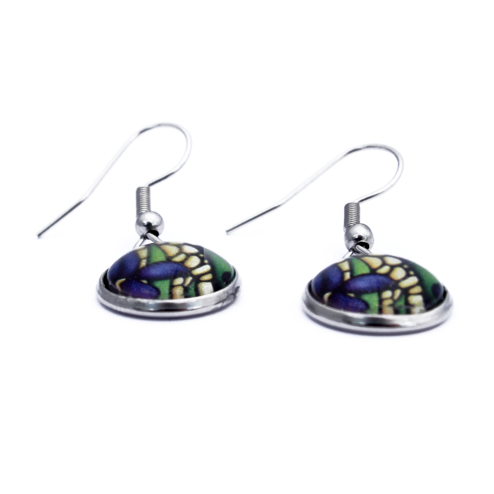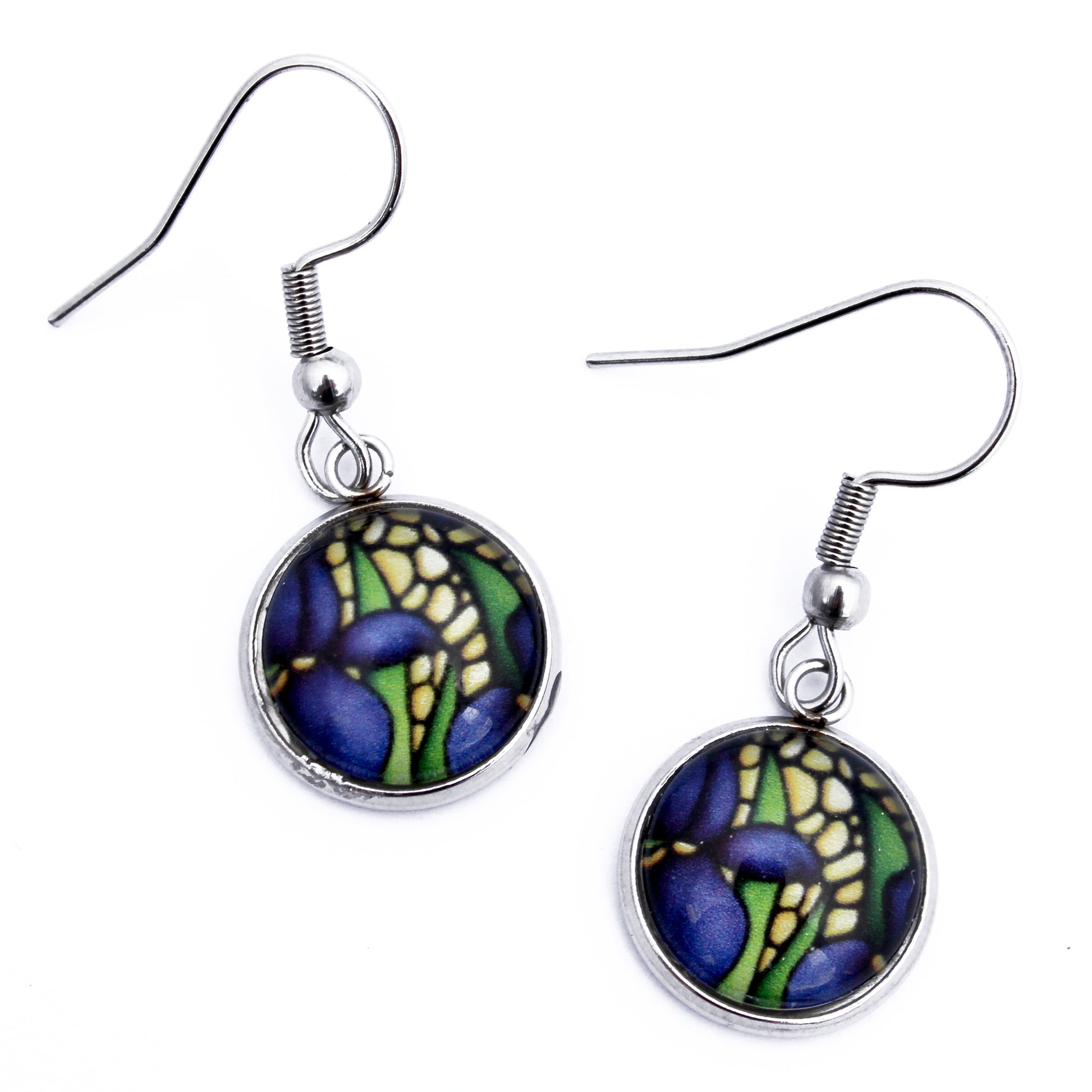 Bold and elegant, these circle earrings feature deep purple iris flowers set against a golden yellow background with lush green leaves. Taken from my original acrylic painting, each pair is a wearable piece of art that brings vibrant garden beauty to your everyday style. Lightweight and full of colour, they’re perfect for flower lovers and art fans alike.