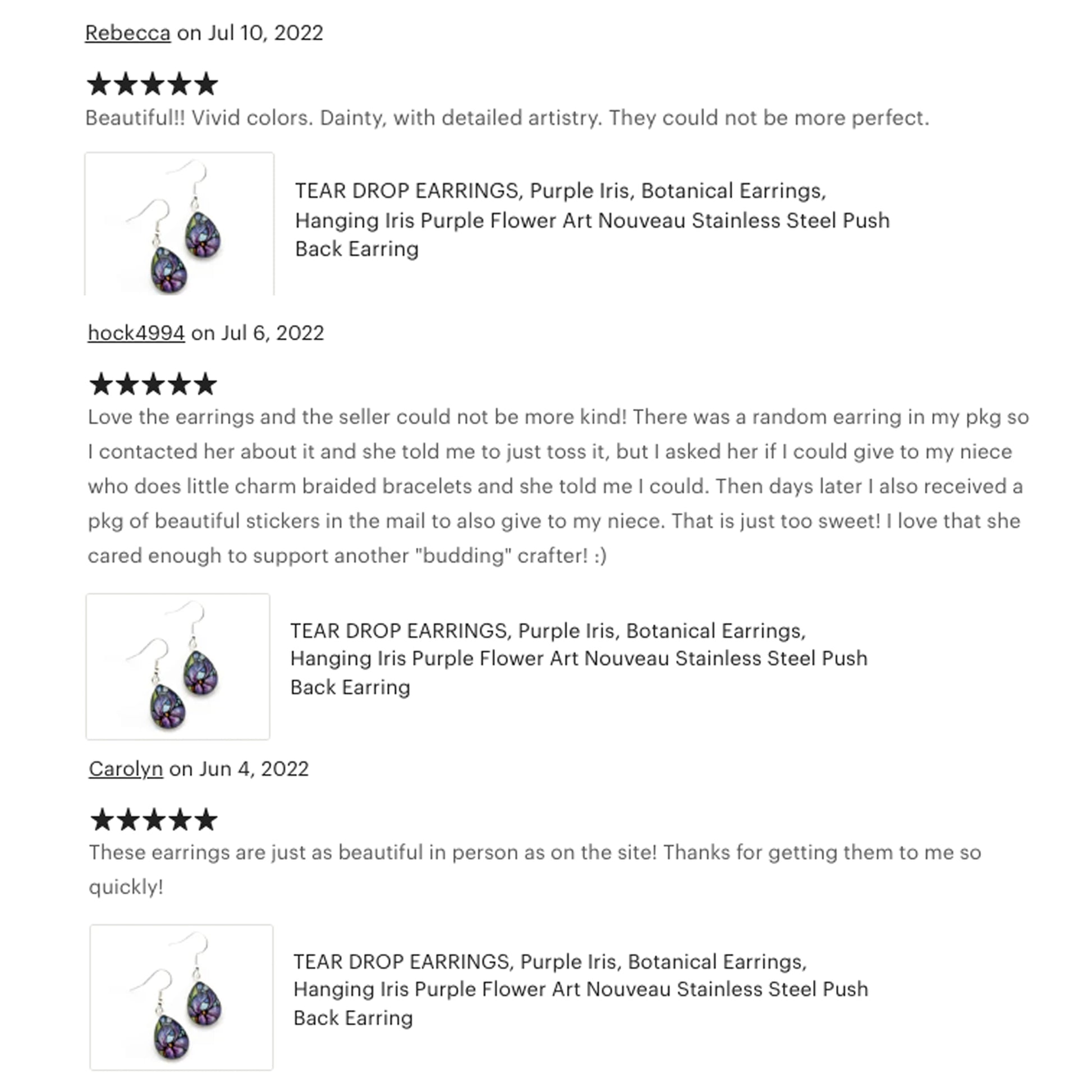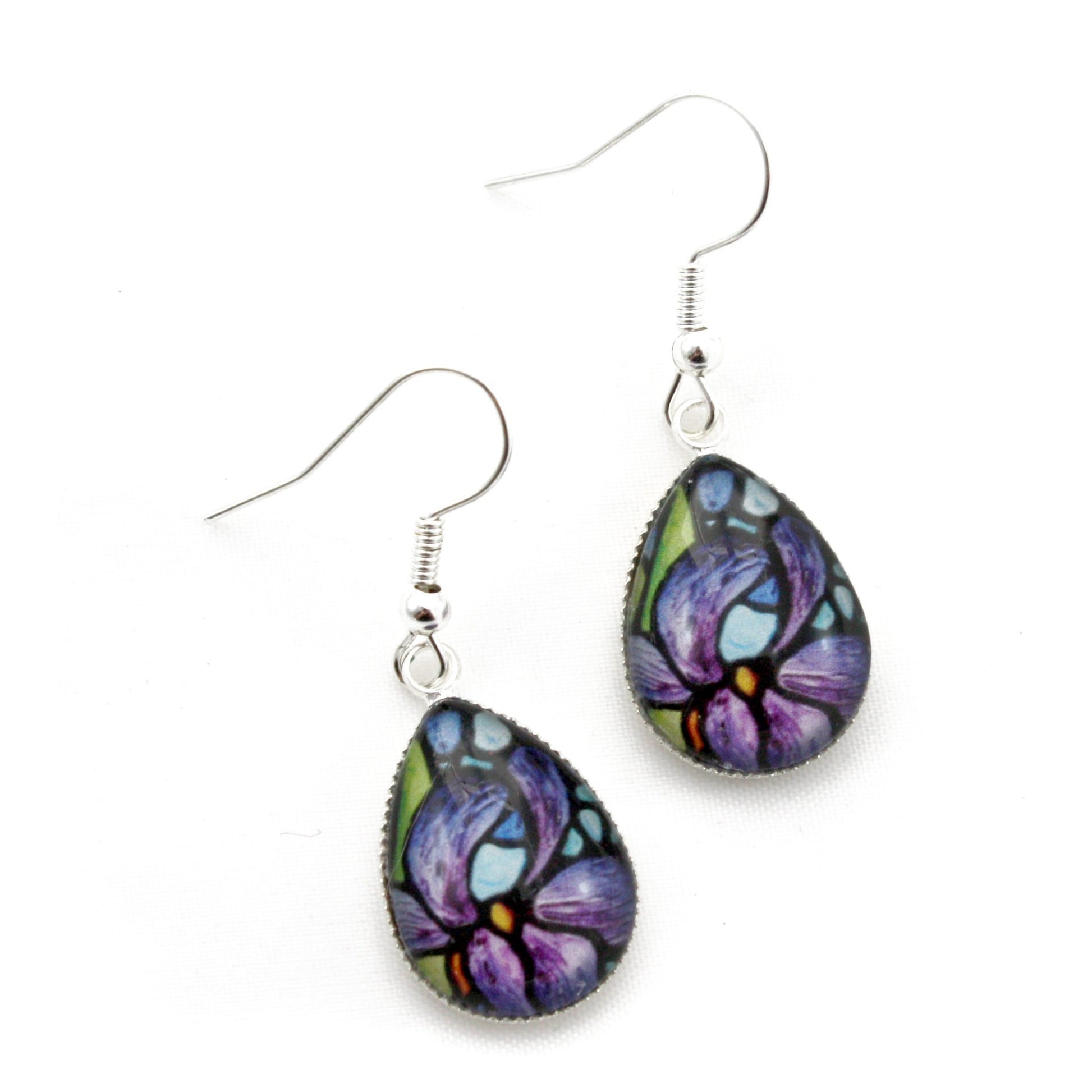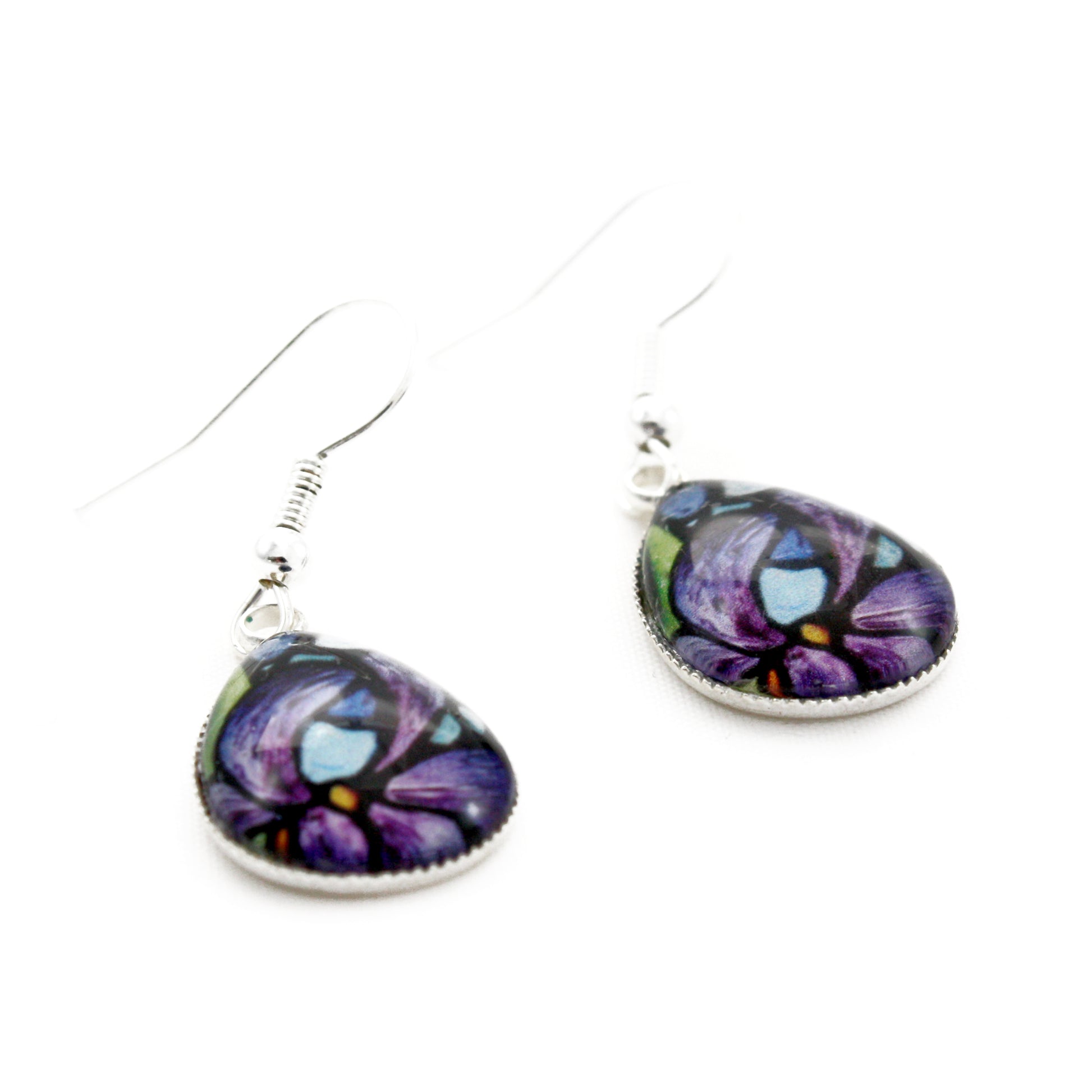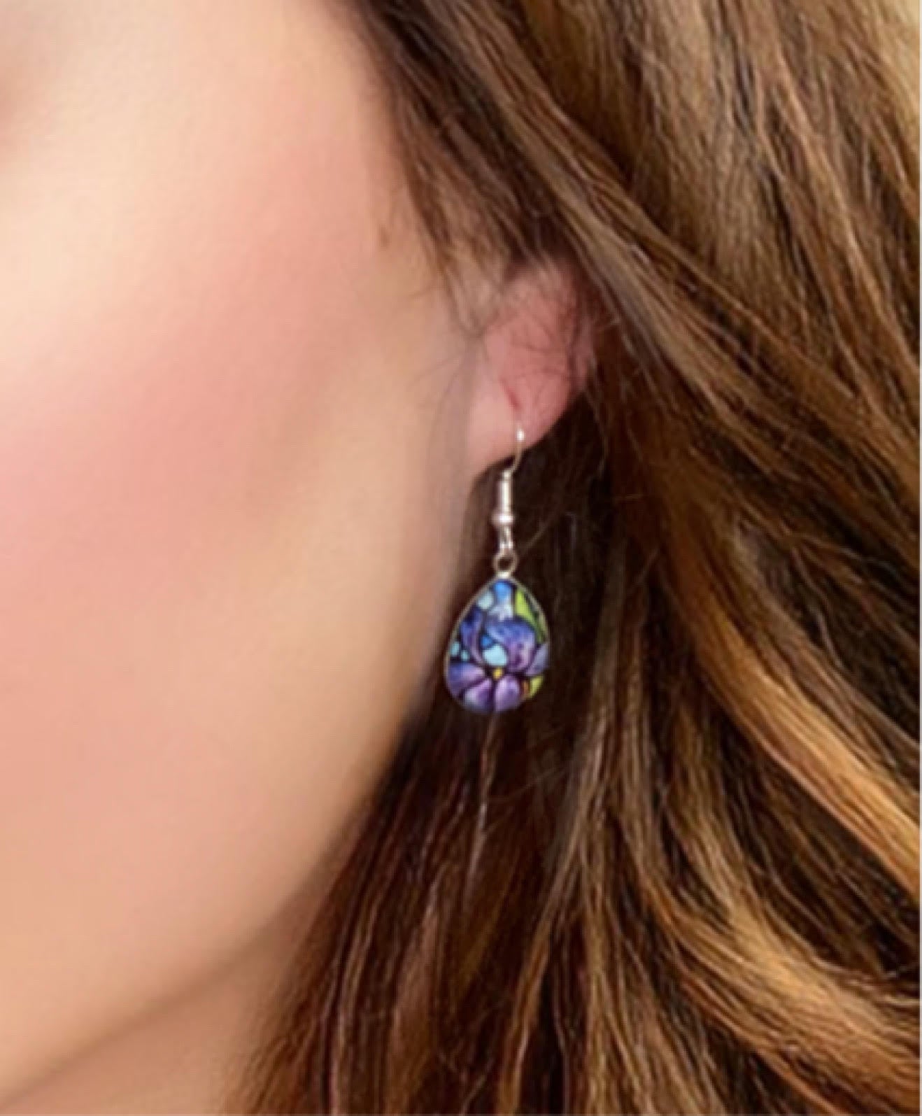 These teardrop earrings feature a vibrant purple iris set against a soft blue sky, using imagery from my original acrylic painting. Elegant and full of colour, they capture the quiet beauty of a blooming garden. Lightweight and easy to wear, they bring a touch of nature’s calm to any outfit.