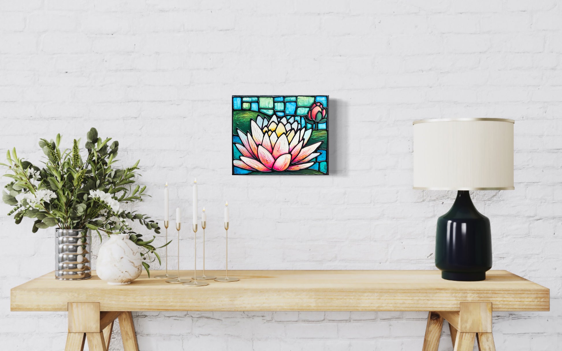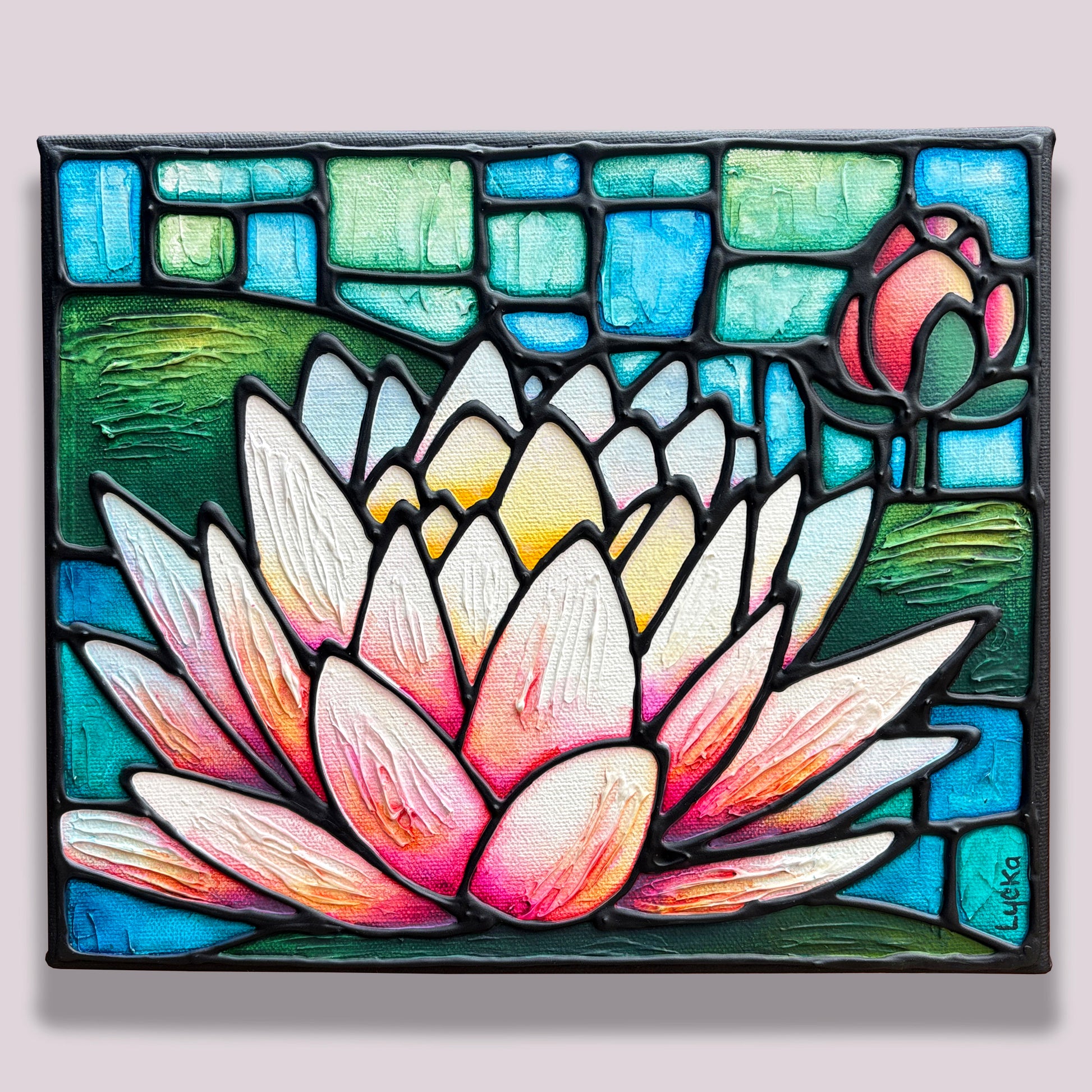 The lotus flower has a long history as a symbol of strength, resilience, and rebirth, making it a popular subject in art. It is painted on gallery depth canvas and has 3 coats of varnish to protect it against fading due to light exposure. The vibrant color scheme makes the painting very eye-catching, while the subtlety allows it to blend into any home setting. It is 8 x 10 inches in size and ready to hang.