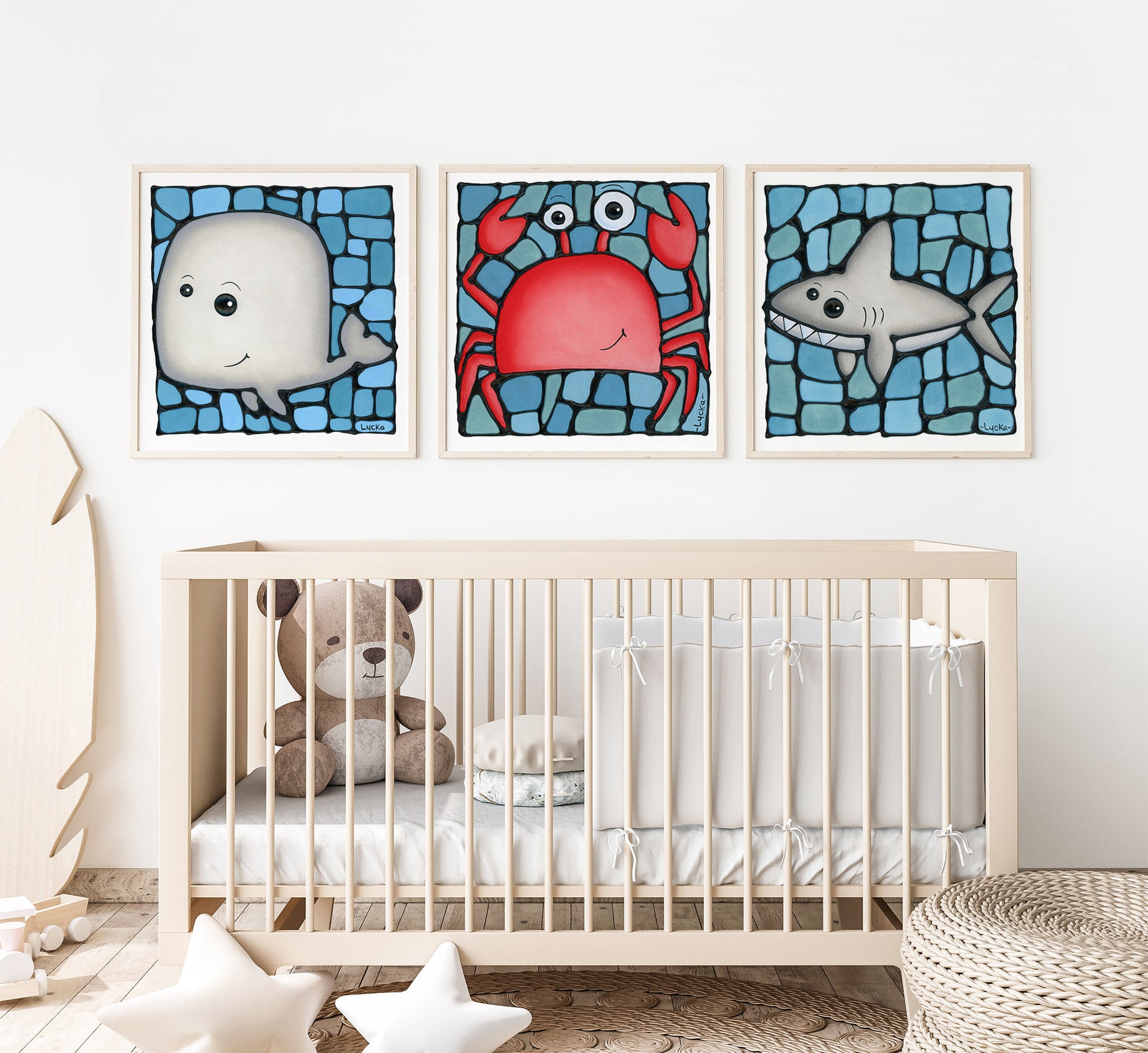 Under the Sea Set of 3 Wall Art Prints, Shark, Crab & Whale