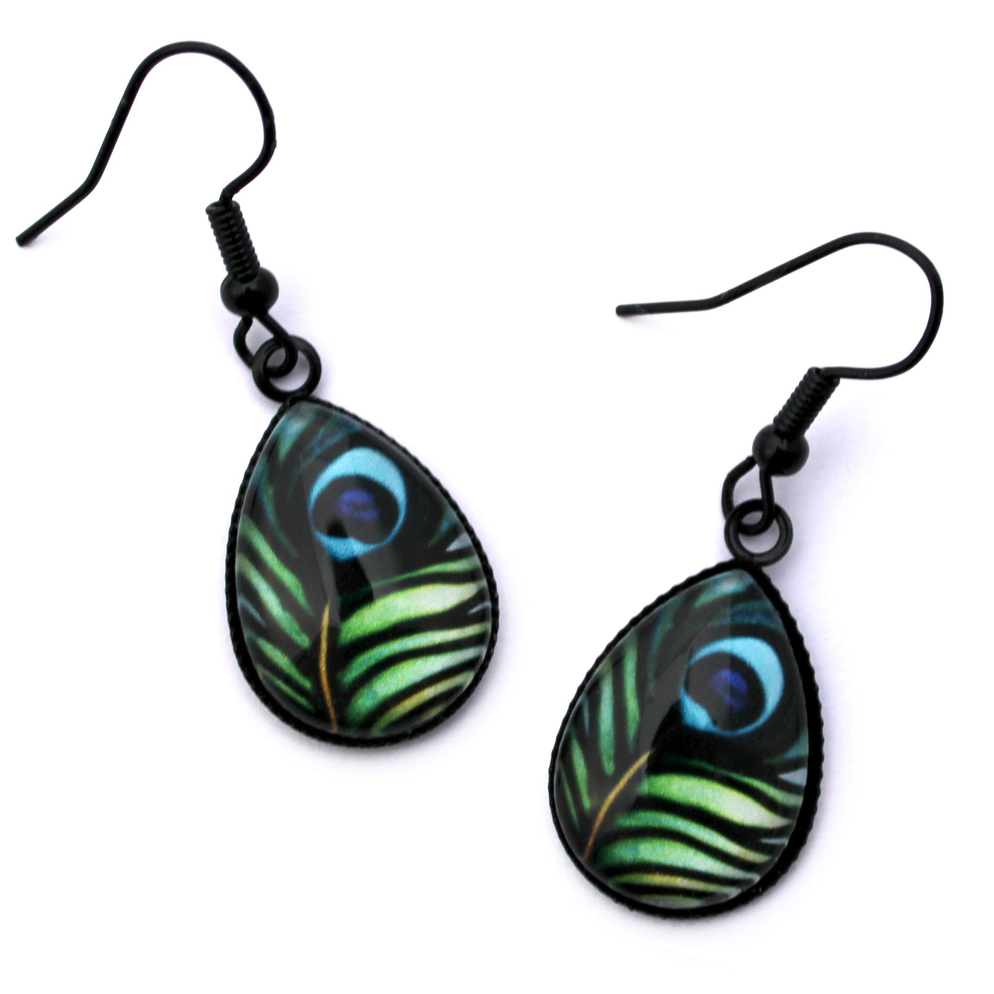 Handmade peacock feather teardrop glass necklace and earrings set featuring artwork from my original acrylic painting.