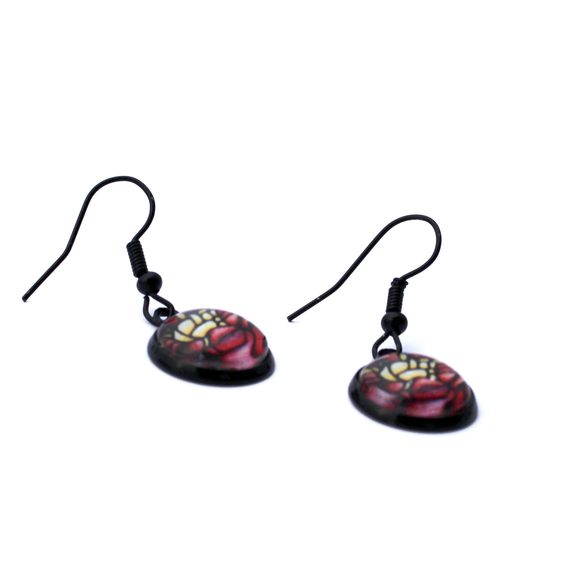 Handmade red peony flower circle glass necklace and earrings set featuring artwork from my original acrylic painting.