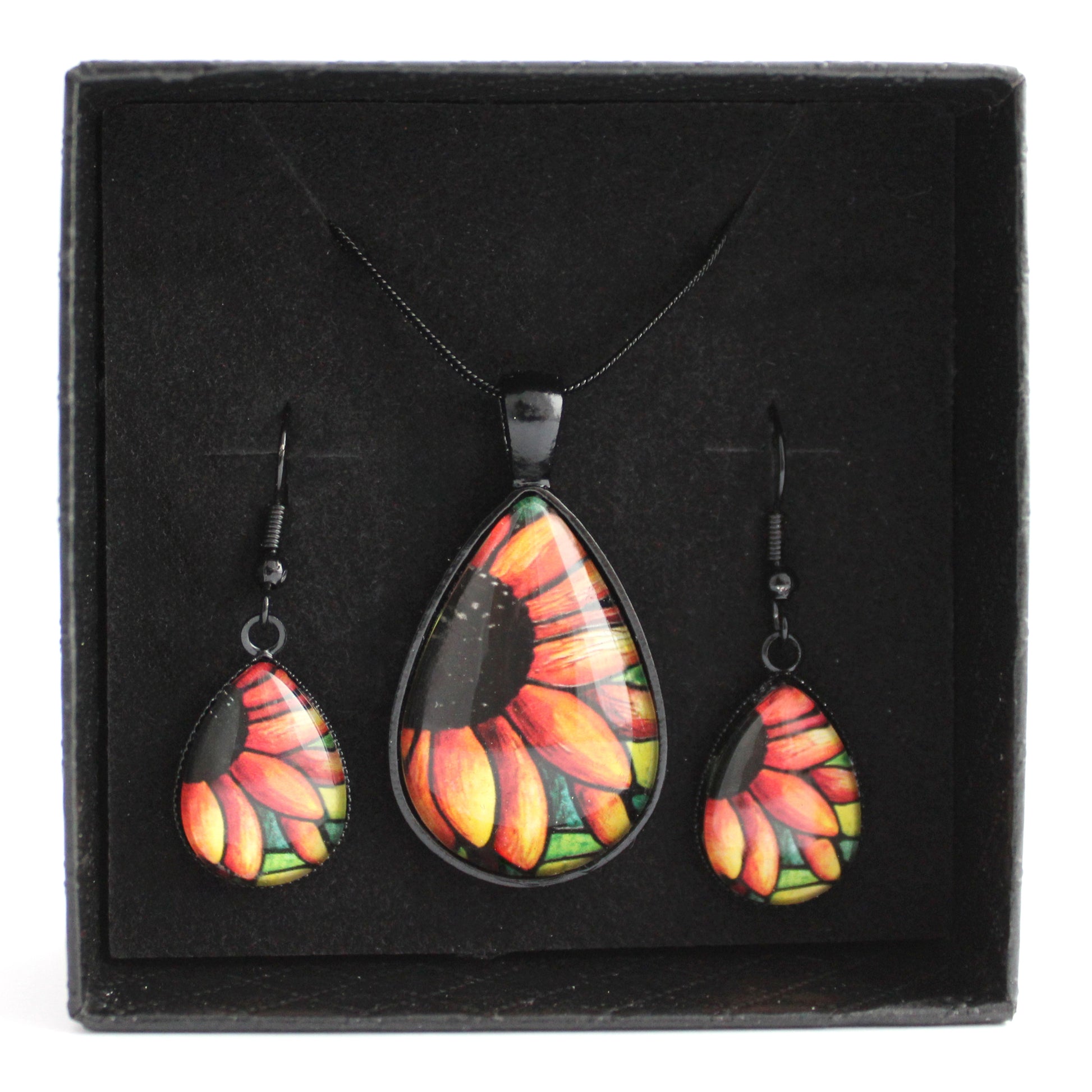 Handmade red sunflower teardrop glass necklace and earrings set featuring artwork from my original acrylic painting.