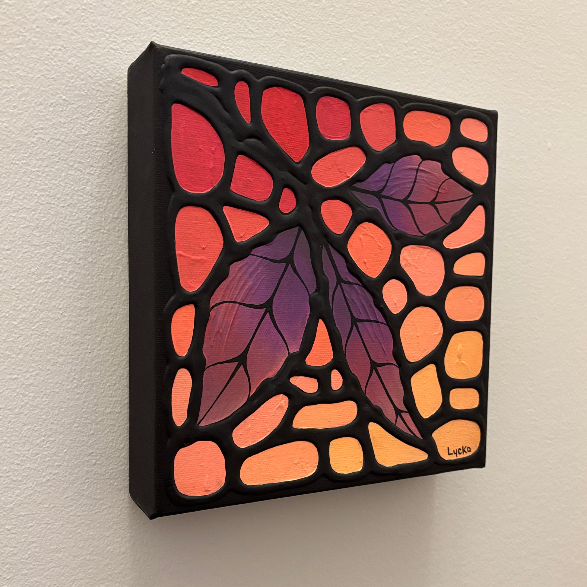 This striking painting captures the fleeting poetry of autumn through a stained-glass lens. Bold black lines create a mosaic of organic shapes, with warm gradients of sunset hues: fiery reds, burnt oranges, and dusky purples. Delicate leaf veins stretch across the canvas like whispered memories, grounding the abstract composition with a natural rhythm.