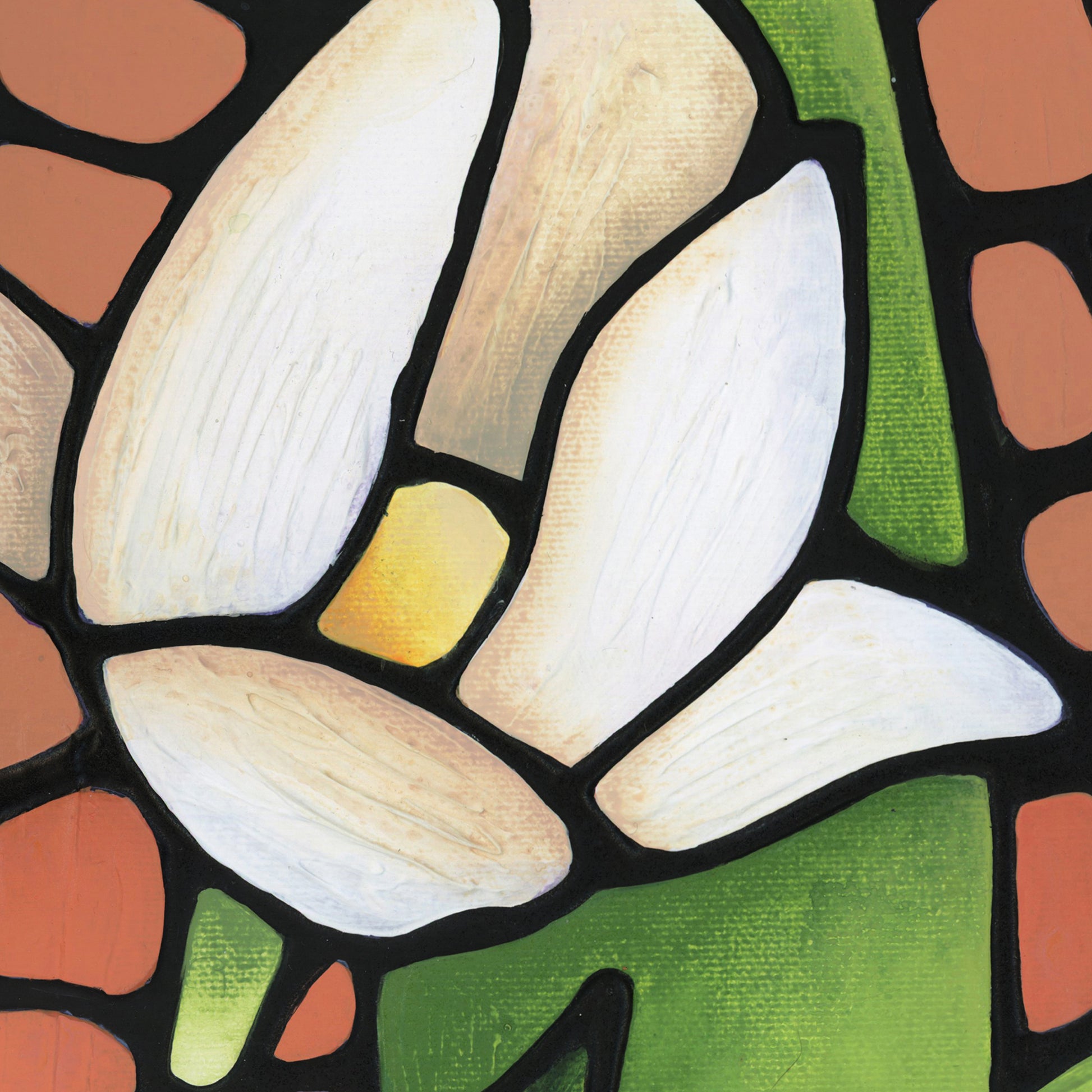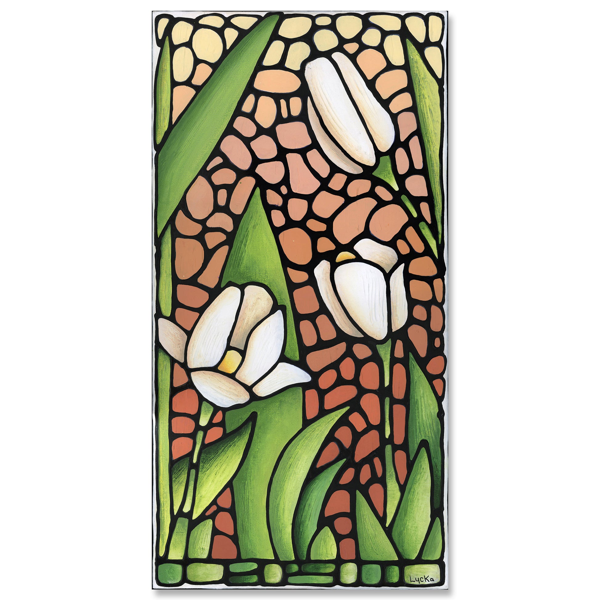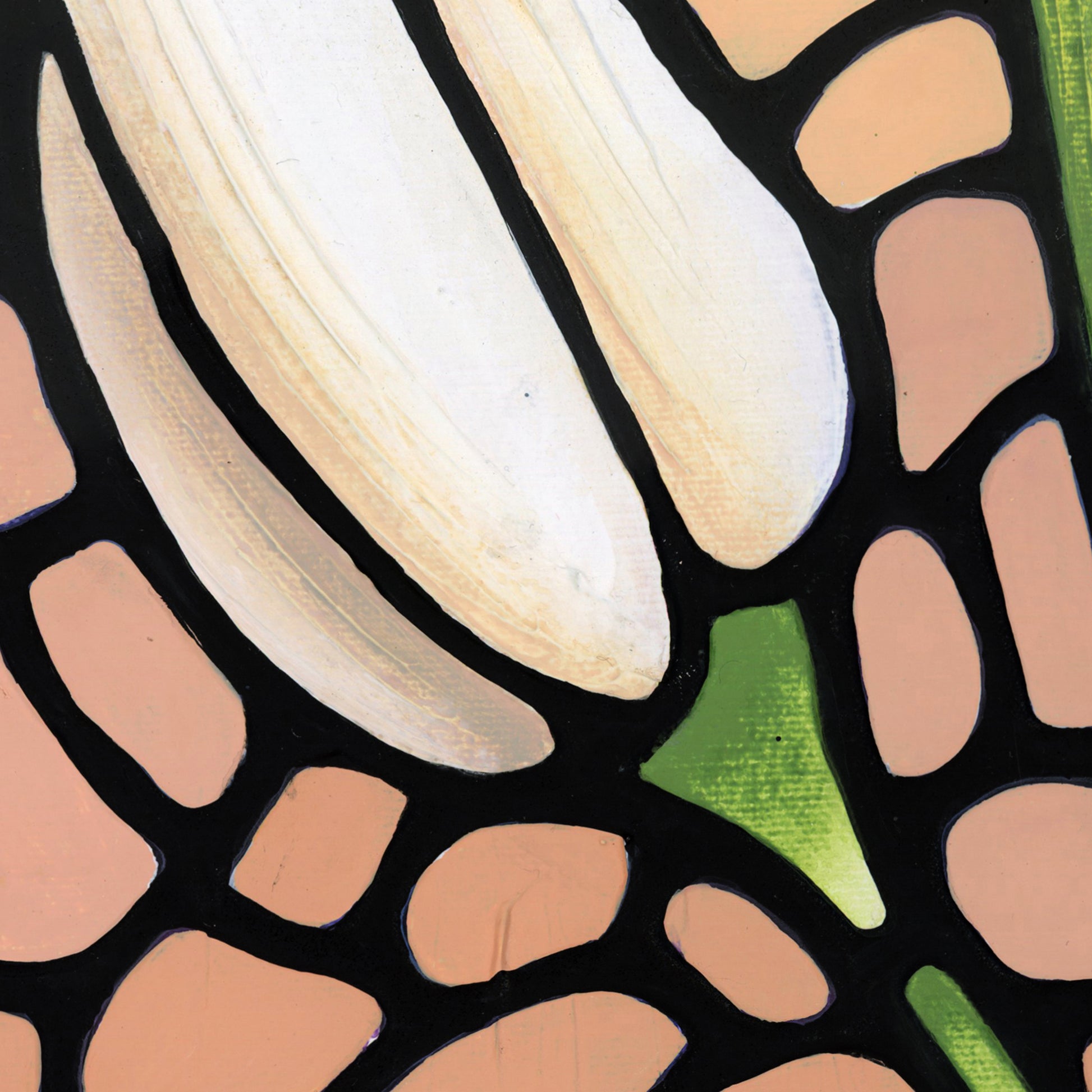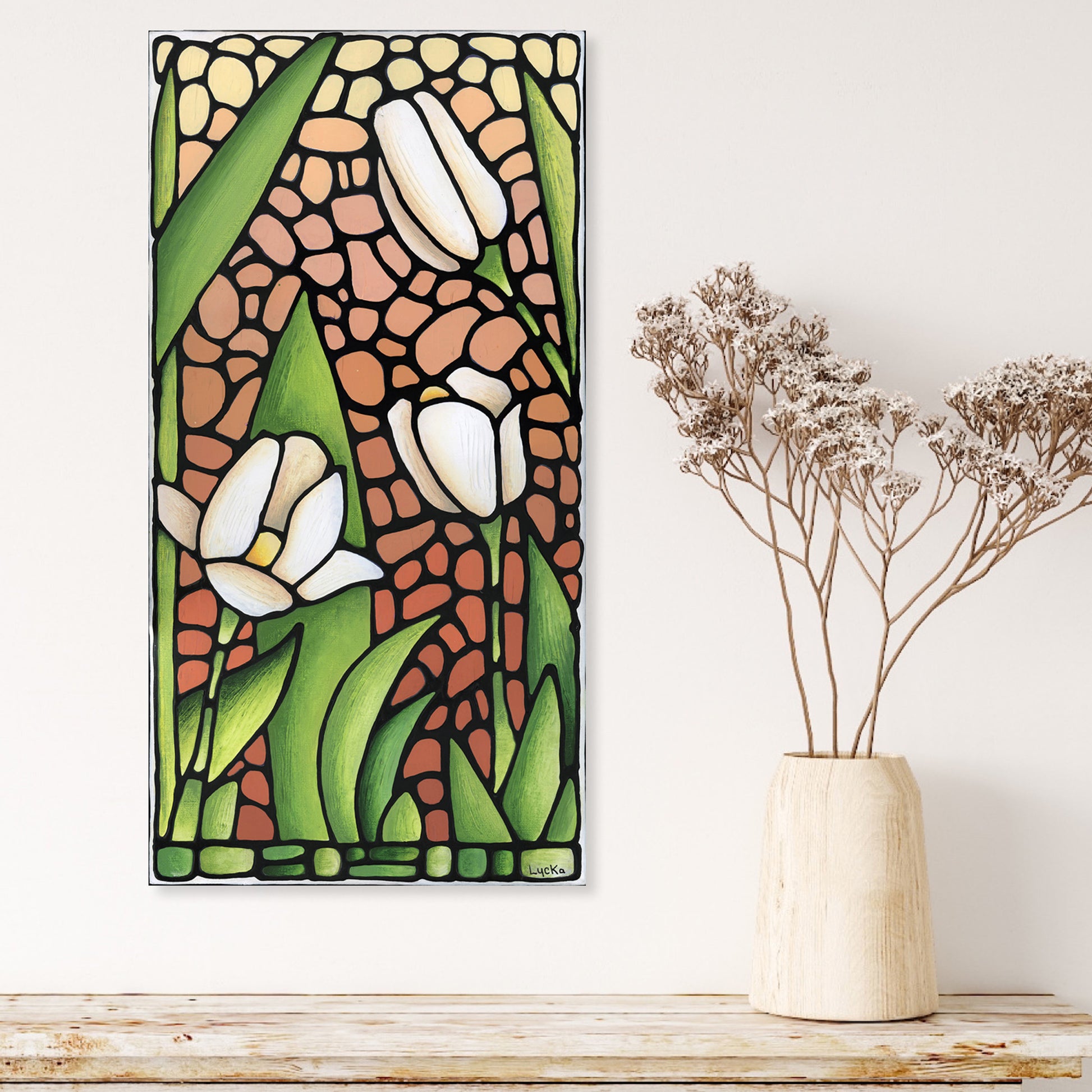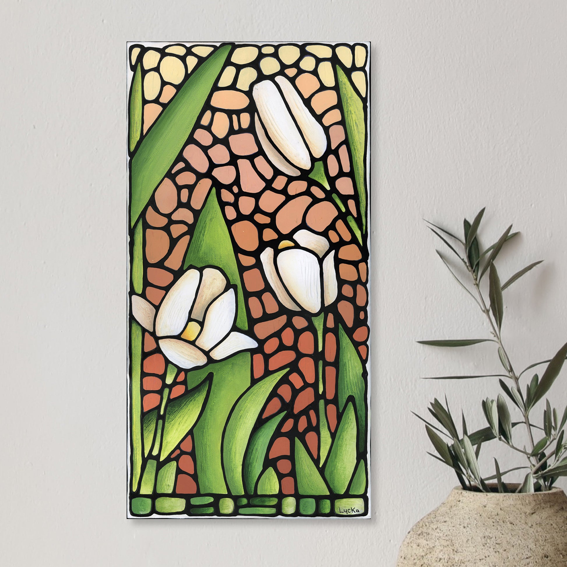 This vibrant painting captures the elegance of three white tulips set against a rich orange background, radiating warmth and energy. Created in a stained-glass-inspired style, the piece features bold black outlines that highlight the intricate details of each petal and leaf. The interplay of crisp white tulips and the fiery backdrop creates a striking contrast, symbolizing purity and renewal amidst a glowing atmosphere. This artwork invites the viewer to revel in the harmony of nature and the timeless beauty of stained glass.